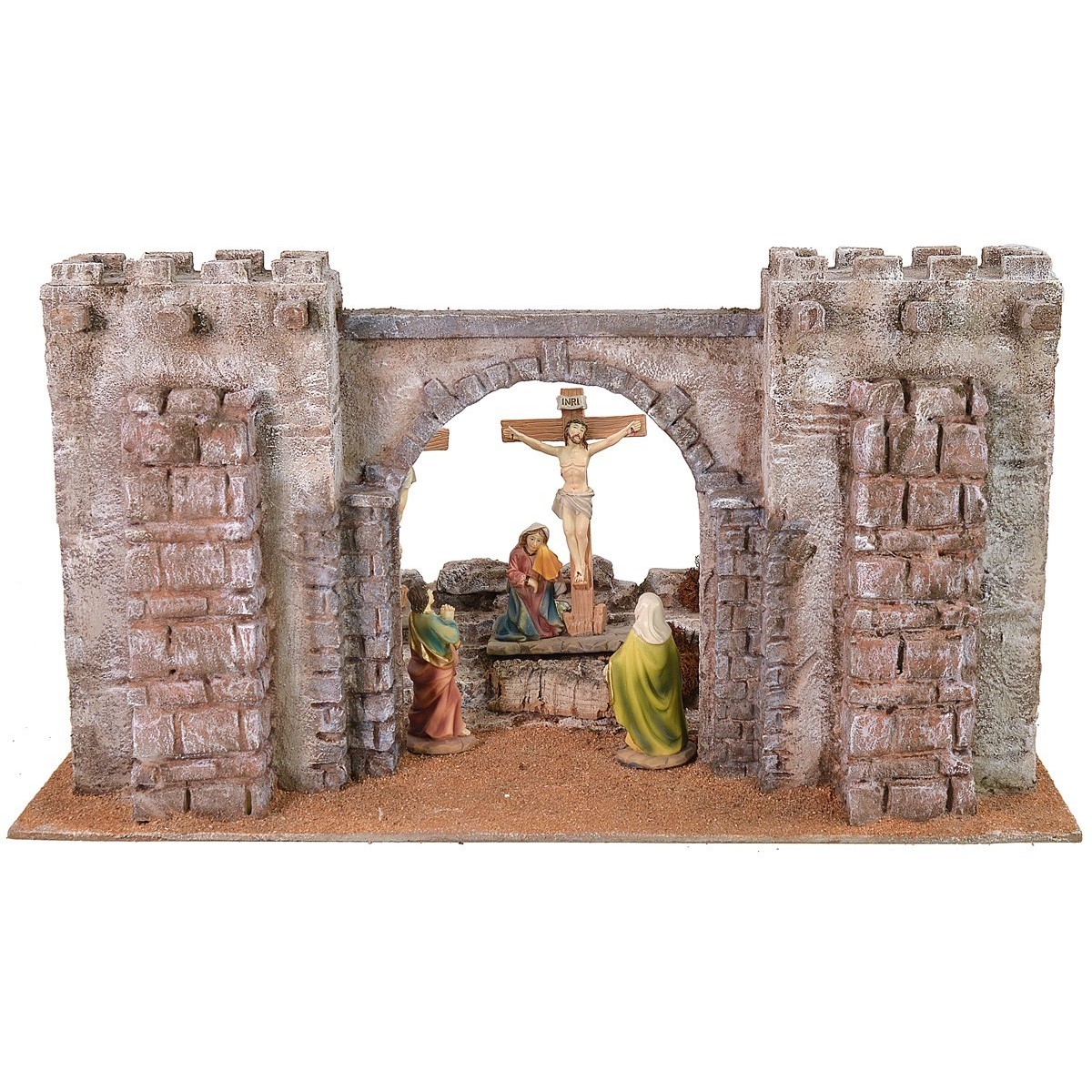 Ambientación que representa la crucifixión de Cristo. En primer plano, la fachada de una fortaleza con dos torres laterales y una apertura en arco desde la cual se vislumbran las tres cruces de madera: la central, en la que será crucificado Jesús, y las dos laterales para los ladrones. La escena es adecuada para estatuas de altura de 9 cm o 10 cm disponibles en los productos relacionados; la ambientación se vende vacía sin estatuas y las imágenes completas tienen un propósito meramente ilustrativo. El artículo ha sido producido en Italia por hábiles manos artesanas con poliestireno, madera y corcho.