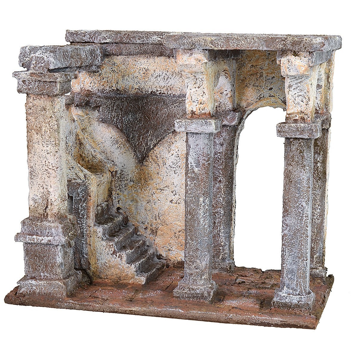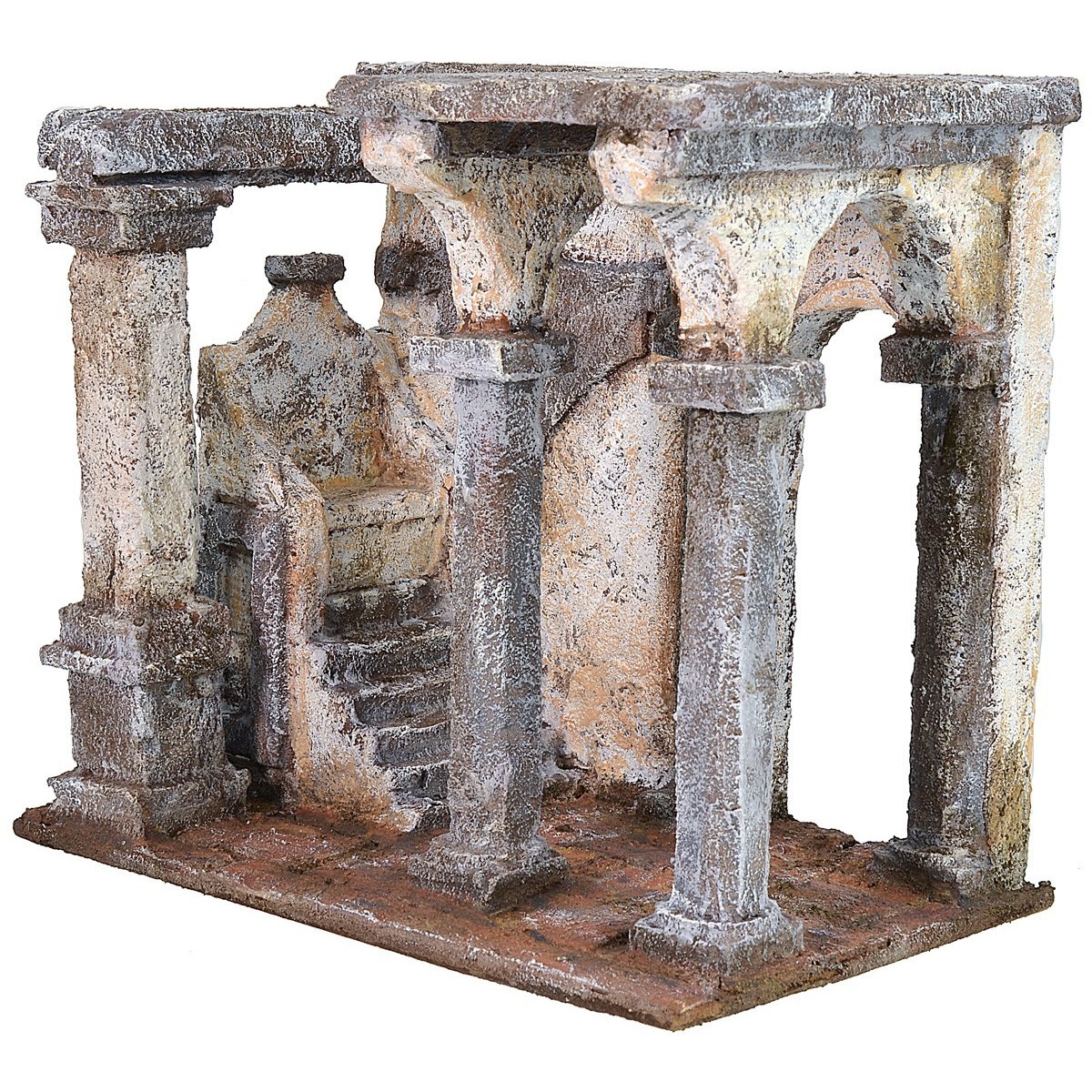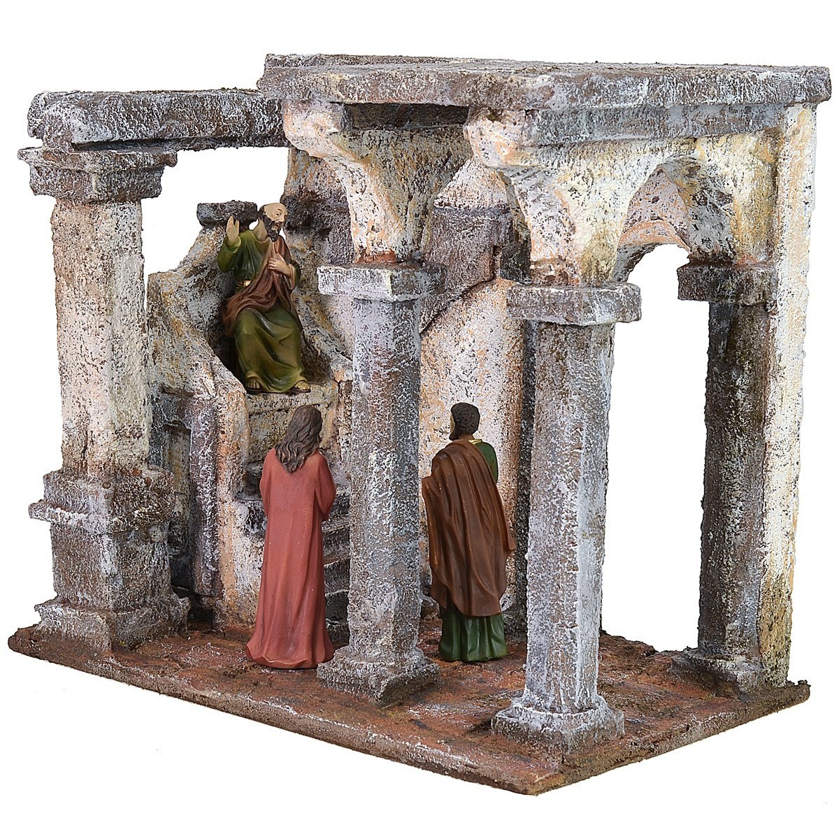 Ambientación que representa la flagelación de Cristo. La escena se desarrolla en un foro al aire libre y toda la atención se centra en el trono elevado desde donde Pilato pronunció la sentencia de muerte a Jesús. Delante encontramos la estructura con arcos y columnas a la que fue atado y flagelado. La ambientación es adecuada para estatuas de altura de 9 cm o 10 cm disponibles en los productos relacionados. La escenografía se vende vacía sin estatuas y las imágenes completas tienen un propósito meramente ilustrativo. El artículo fue producido en Italia por hábiles manos artesanas con poliestireno, madera y corcho.