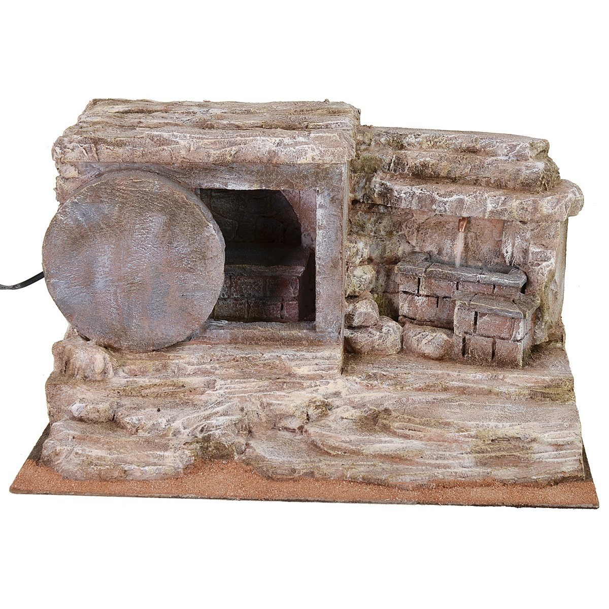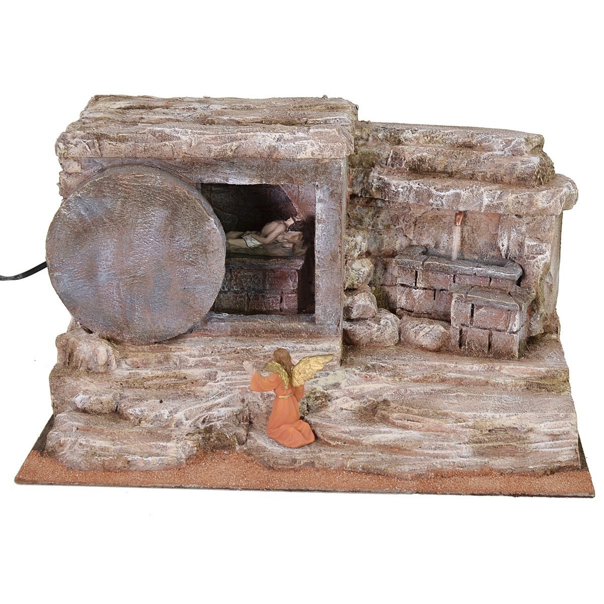 Sepulcro en el que se colocó el cuerpo de Cristo, la estructura está tallada en la roca con una entrada cuadrada a la que se adosa una puerta de piedra redonda, a la derecha una fuente. El escenario es adecuado para estatuas de altura de 9 cm o 10 cm disponibles en los productos relacionados, la escenografía se vende vacía sin estatuas y las imágenes completas tienen un propósito meramente ilustrativo. El artículo fue producido en Italia por hábiles manos artesanas con poliestireno, madera y corcho.