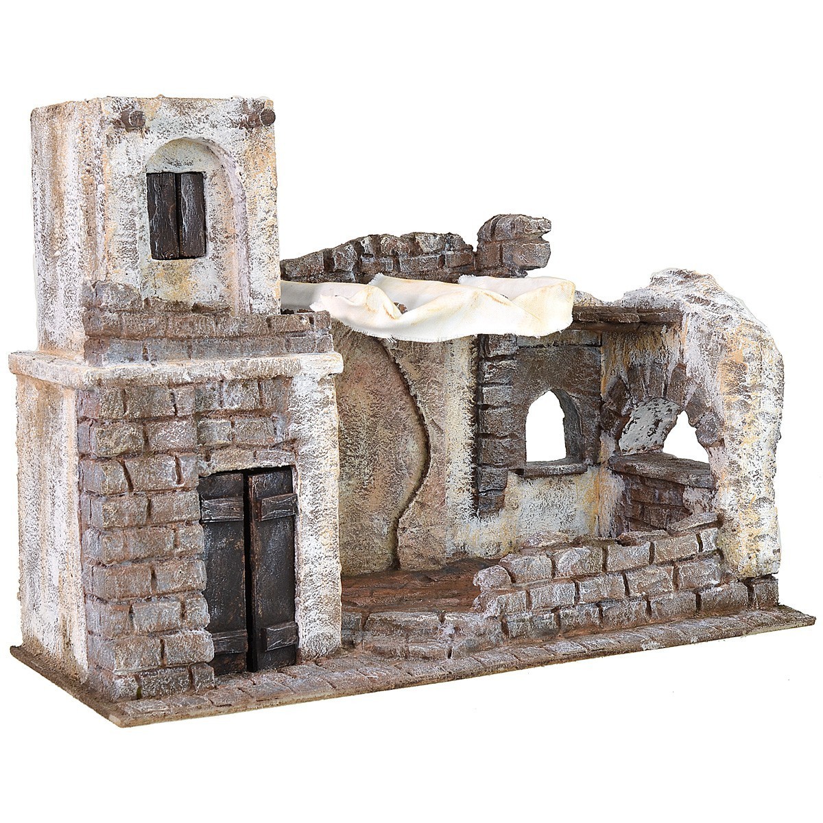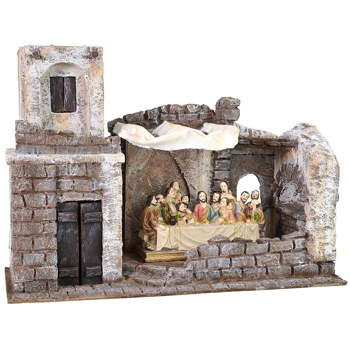 Ambientación que representa la última cena de Jesús. La escena se desarrolla en el exterior junto a una vivienda de dos pisos, bajo una carpa donde es posible colocar la gran mesa con todas las estatuas. La escenografía es adecuada para estatuas de altura de 9 cm o 10 cm disponibles en los productos relacionados, la escenografía se vende vacía sin estatuas y las imágenes completas tienen un propósito puramente ilustrativo. El artículo fue producido en Italia por manos artesanas expertas con poliestireno, madera y corcho.