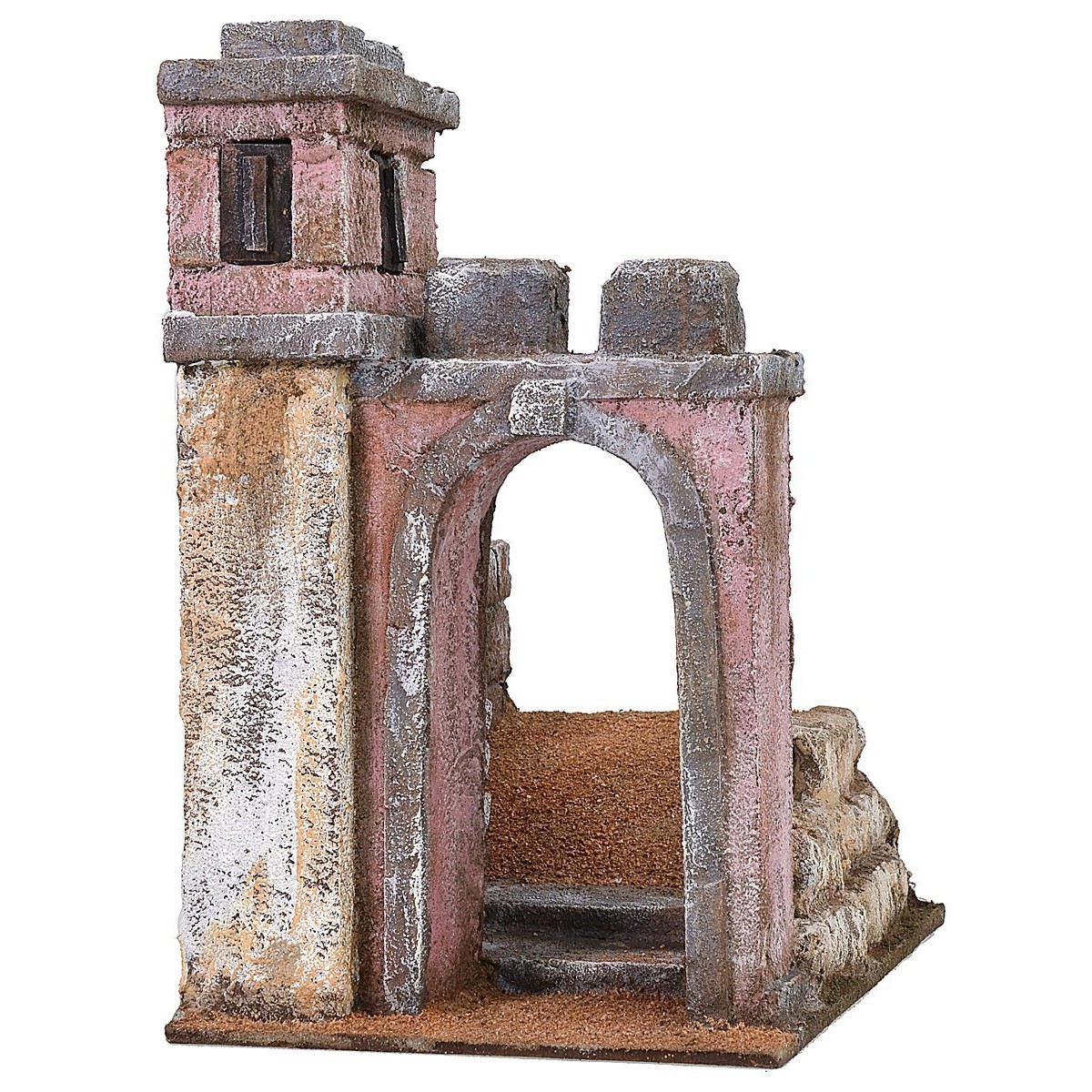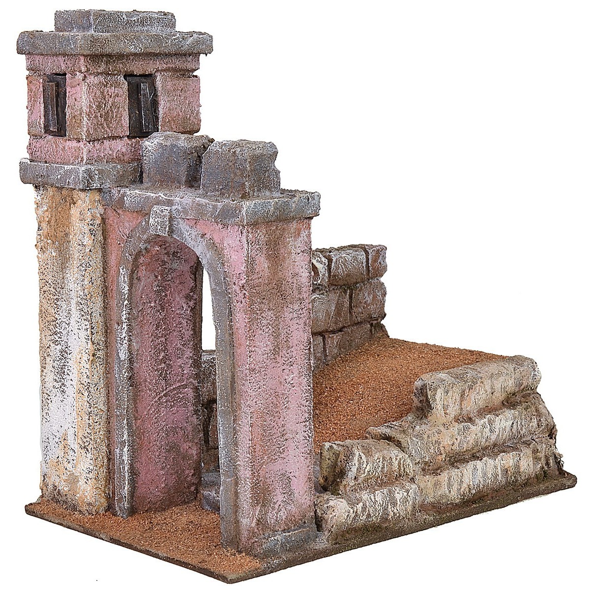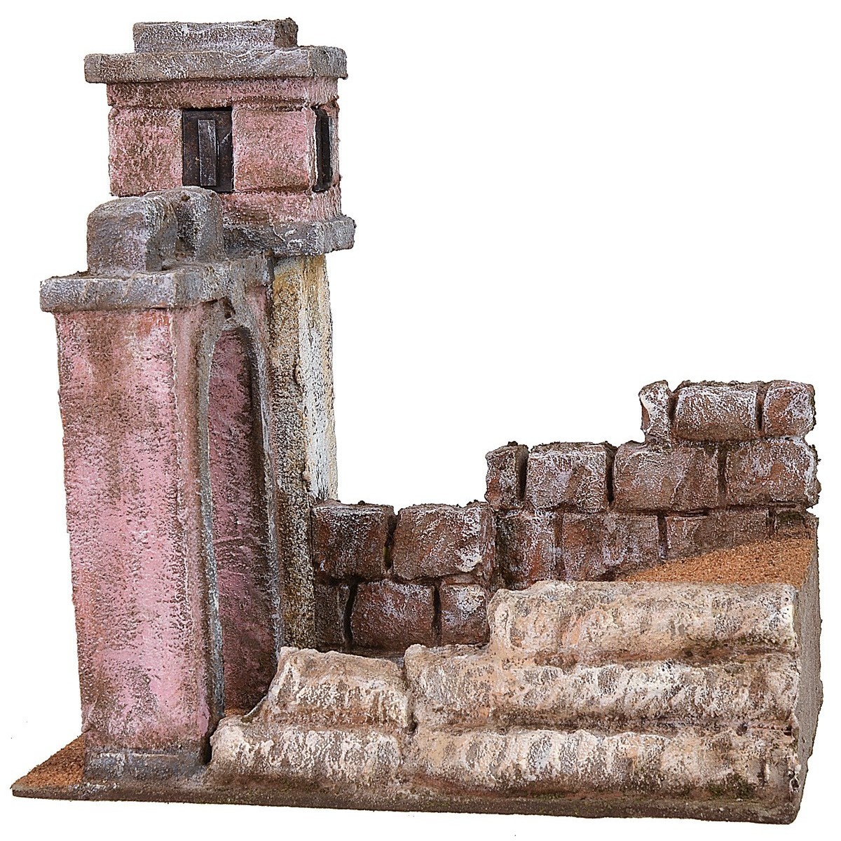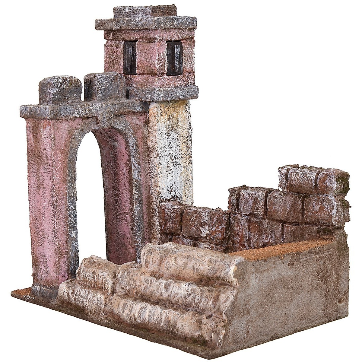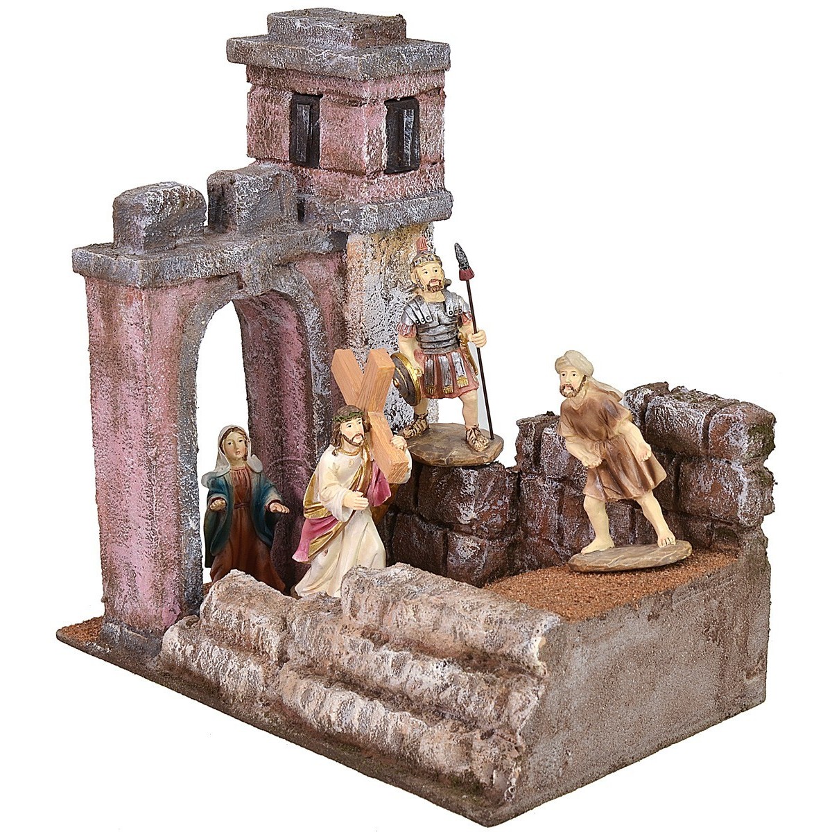 Escenario que representa un tramo de camino recorrido por Jesús con la cruz a cuestas. El producto es parte de una serie que se puede componer y personalizar; el objeto en particular representa la salida por la puerta de la ciudad con el inicio de un camino en subida hacia el monte calvario. La escenografía es adecuada para estatuas de 9 cm o 10 cm de altura disponibles en los productos relacionados; la escenografía se vende vacía sin estatuas y las imágenes completas tienen un propósito puramente ilustrativo. El artículo ha sido producido en Italia por hábiles manos artesanas con poliestireno, madera y corcho.