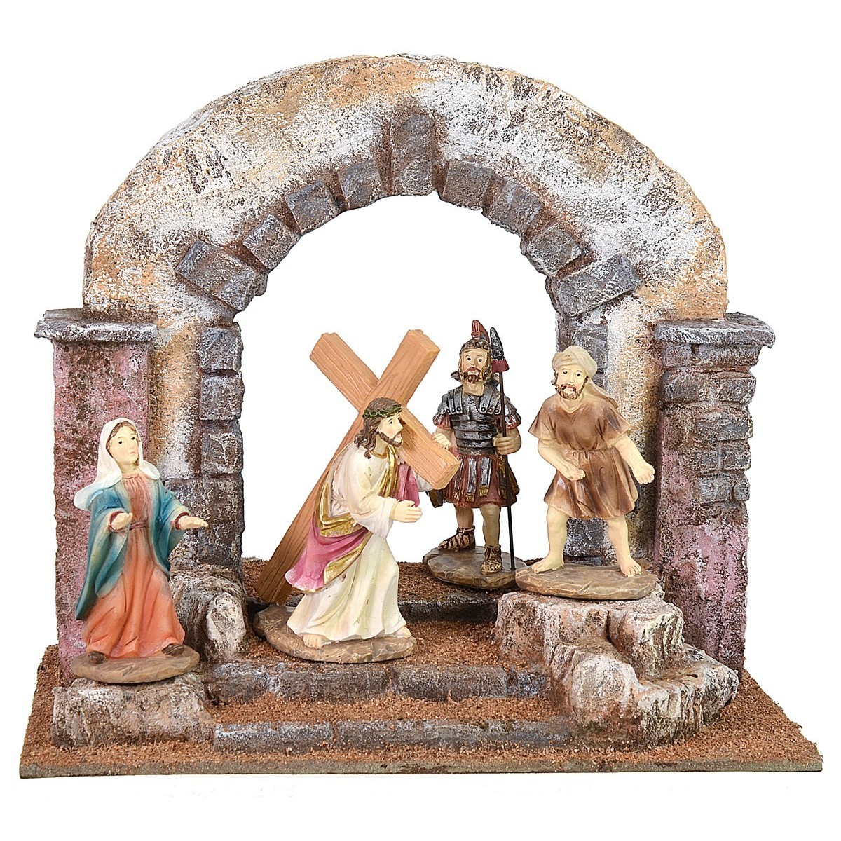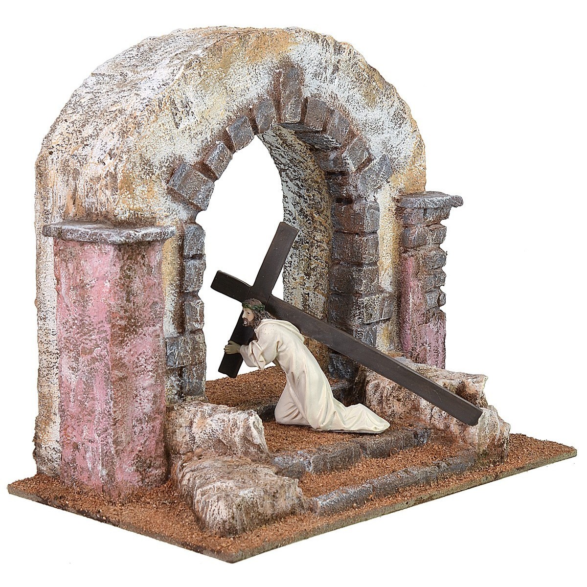 Ambientación que representa un tramo de camino recorrido por Jesús con la cruz a cuestas. El producto forma parte de una serie componible y personalizable, el arco atravesado con esfuerzo por Jesús en su ascenso al monte Gólgota. La escenografía es adecuada para estatuas de altura de 9 cm o 10 cm disponibles en los productos relacionados, la escenografía se vende vacía sin estatuas y las imágenes completas tienen un propósito meramente ilustrativo. El artículo ha sido producido en Italia por manos artesanas expertas con poliestireno, madera y corcho.
