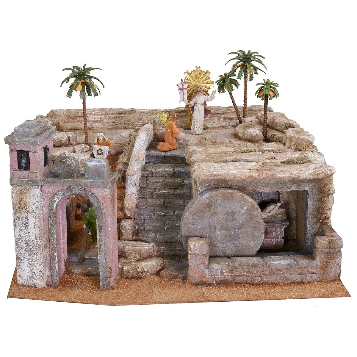 Diorama de Pascua que representa algunas estaciones del Vía Crucis, a la izquierda el arco del tribunal desde donde Jesús con la cruz se dirige hacia el monte Calvario, mientras que a la derecha en primer plano el sepulcro semiabierto donde se vislumbra el cuerpo de Cristo exánime. Subiendo las escaleras a la izquierda, María Magdalena asombrada con el sudario de Jesús entre las manos después de encontrar el sepulcro vacío, mientras que a la derecha Cristo resucitado con el ángel. La escena está completa con estatuas de resina de 9 cm de altura que pueden colocarse en la ambientación a gusto. El artículo es producido artesanalmente en Italia con madera de poliestireno y corcho.