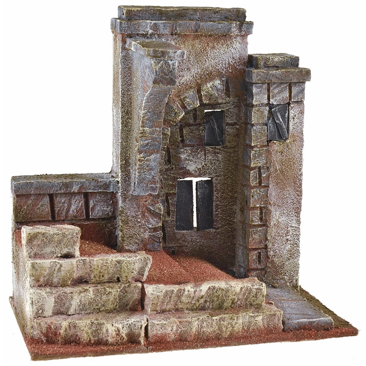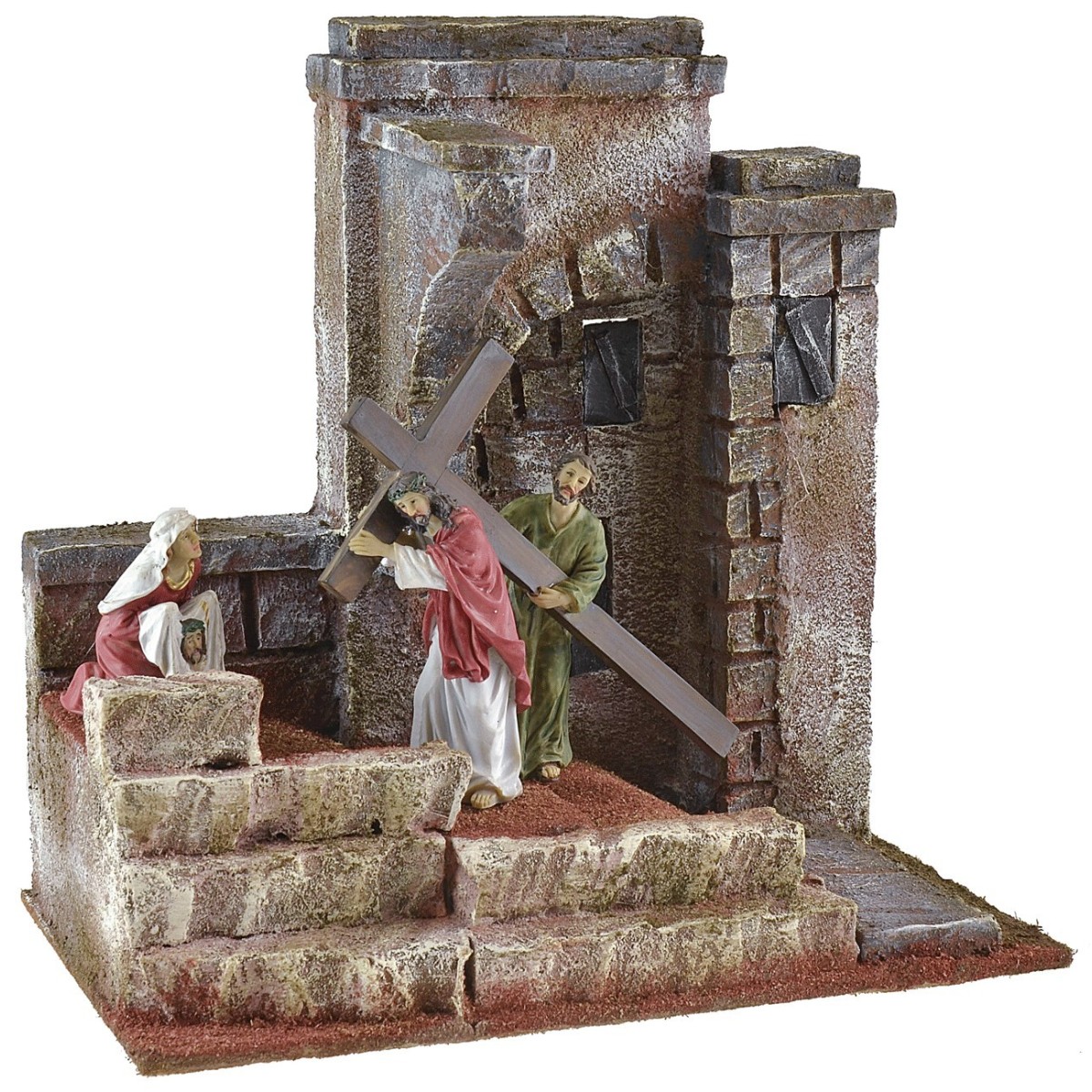 Ambientación que representa un tramo de camino recorrido por Jesús con la cruz a cuestas. El producto es parte de una serie componible y personalizable; el objeto en particular representa un vistazo de un viejo edificio frente al cual pasó en su doloroso camino de subida hacia el monte calvario. La escenografía es adecuada para estatuas de altura de 9 cm o 10 cm disponibles en los productos relacionados; la escenografía se vende vacía sin estatuas y las imágenes completas tienen un propósito meramente ilustrativo. El artículo ha sido producido en Italia por hábiles manos artesanas con poliestireno, madera y corcho.