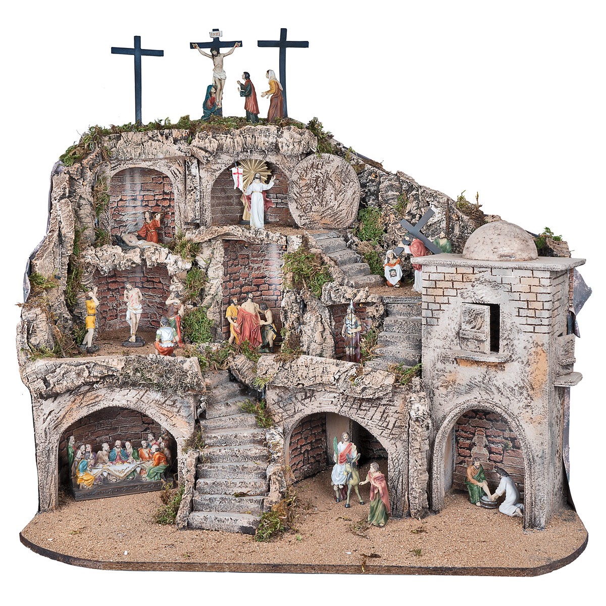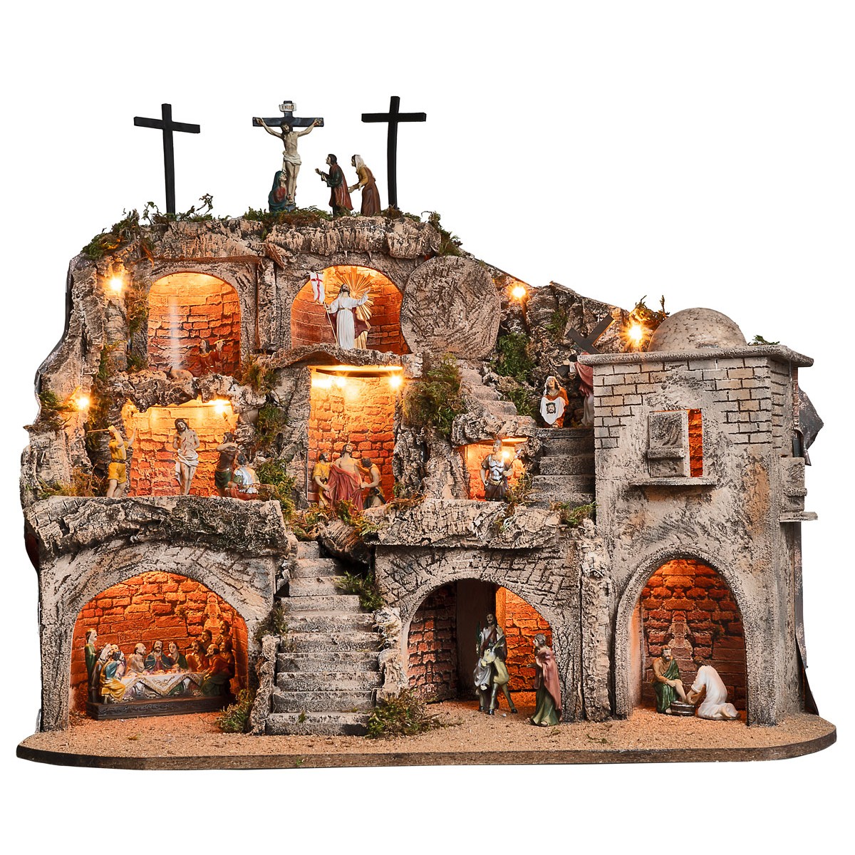 Diorama pascual iluminado, completo de figurillas de resina serie de 9 cm que representan nueve escenas de la Pasión de Cristo. Realizado artesanalmente en Italia con madera, corcho y musgo, presenta una estructura articulada en varios niveles que crea un relato visual capaz de acompañar al observador a través de los momentos más significativos.