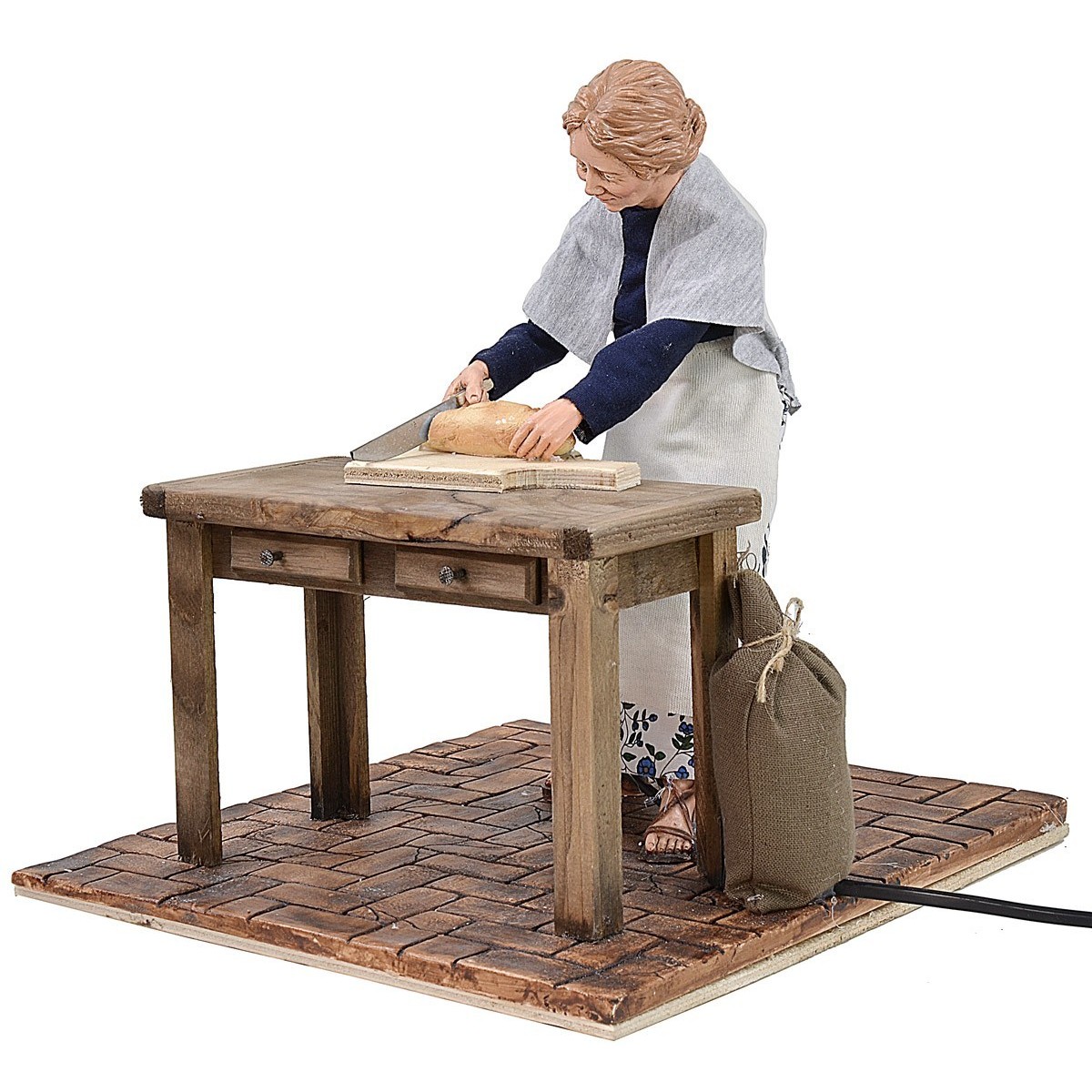 Mujer popular en movimiento que, moviendo el brazo con el que sostiene el cuchillo, corta el pan colocado sobre la refinada mesa de madera que sostiene. La estatua presenta un rostro muy expresivo y ha sido cuidada en los más mínimos detalles, desde los colores, las ropas de tela y el movimiento realmente muy realista y fluido. El artículo ha sido realizado en resina por maestros artesanos italianos y el mecanismo funciona con corriente. Al ser un producto realizado completamente a mano, los colores de las ropas pueden variar.