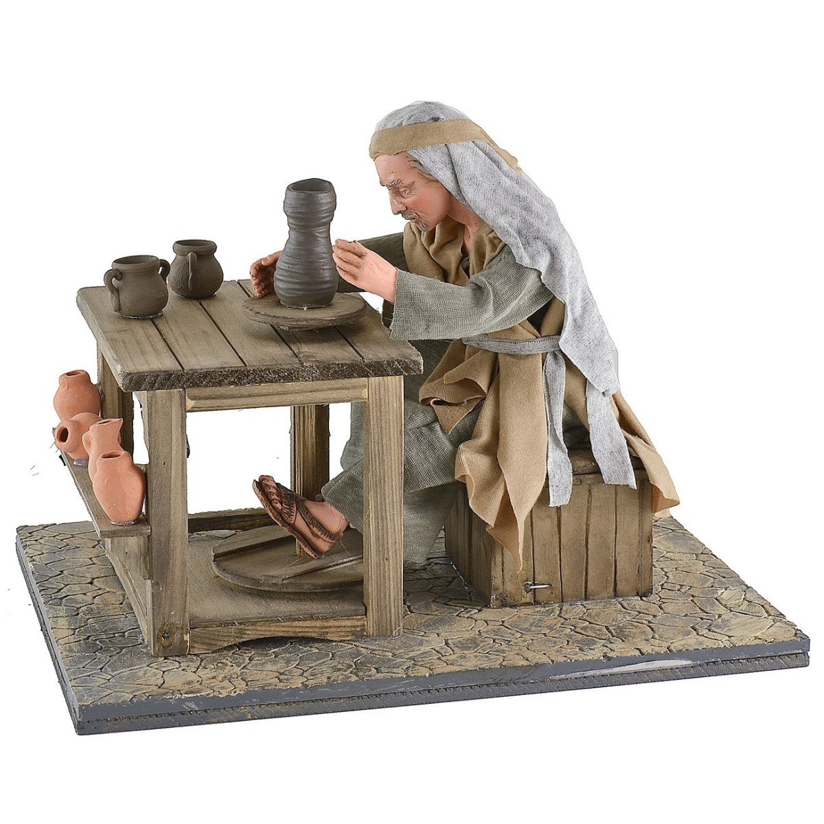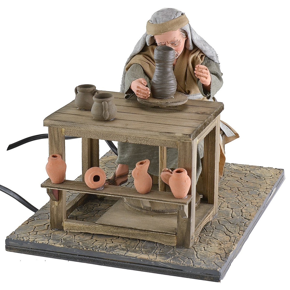 Alfarero árabe sentado en movimiento mientras trabaja la terracota, con el pie gira el torno y con la mano derecha que sube y baja da forma al jarrón. La estatua presenta un rostro muy expresivo y ha sido cuidada en los mínimos detalles, desde los colores, la ropa de tela y el movimiento muy realista y fluido. El artículo ha sido realizado en resina por maestros artesanos italianos y el mecanismo funciona con corriente. Al ser un producto realizado completamente a mano, los colores de la ropa pueden variar de las fotos.