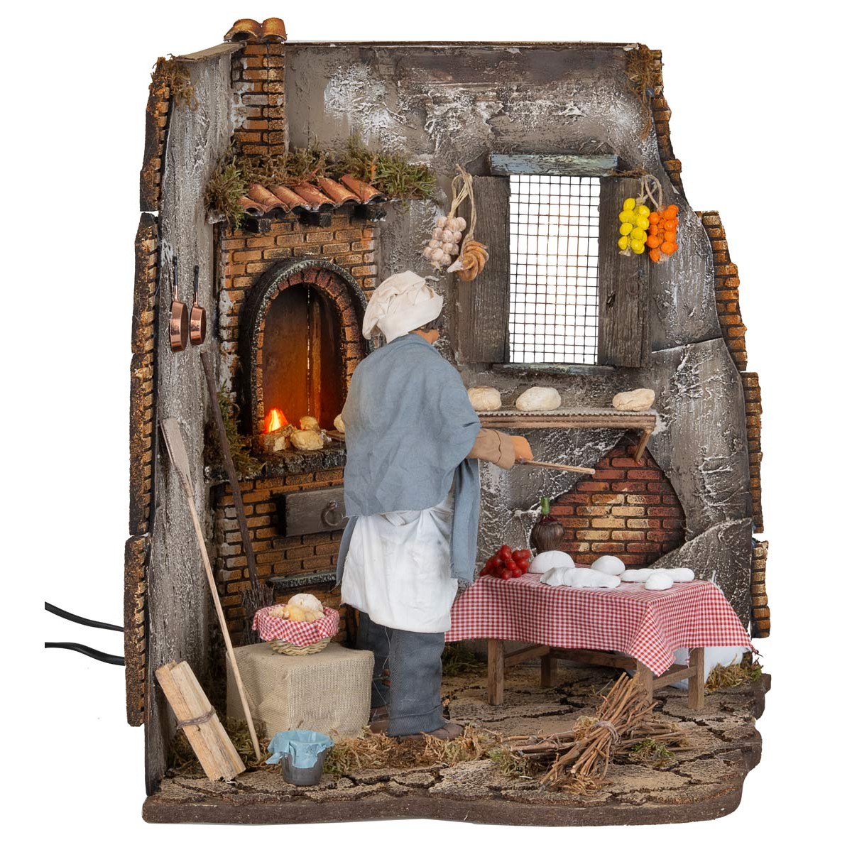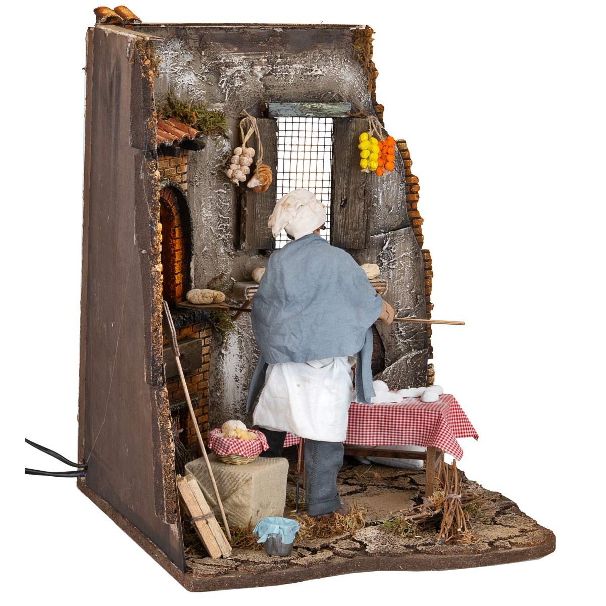 La escena representa al panadero frente al horno mientras hornea el pan con la pala de madera. El horno está iluminado con luz de efecto fuego que recrea el realismo de la llama. La figurita está hecha de terracota pintada a mano, acabada en los detalles y completada con ropa de tela bien acabada.