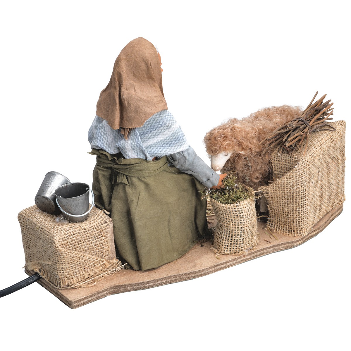 Campesina en terracota vestida de la serie 30 cm con doble movimiento, representada mientras da de comer a la oveja.