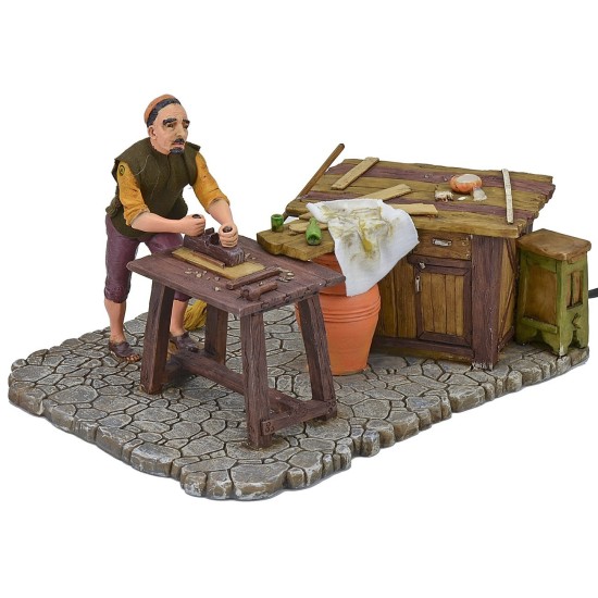 Artesano en movimiento baja el cuerpo y mueve el cepillo para alisar la madera. La meticulosidad en el estudio de los detalles y la expresividad de los rostros son características que distinguen toda la serie Pigini, además de trajes en telas finamente cosidas según los sujetos.