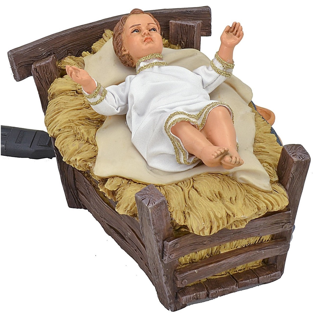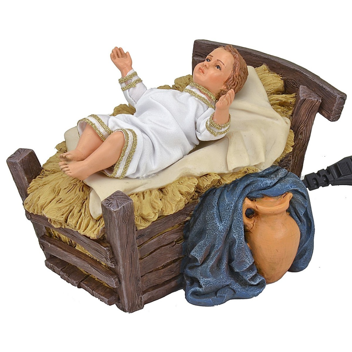 El Niño Jesús en la cuna en movimiento levanta y baja la cabeza mientras abre los brazos. La meticulosidad en el estudio de los detalles y la expresividad de los rostros son características que distinguen toda la serie Pigini, además de los vestidos en telas finamente cosidas según los sujetos.