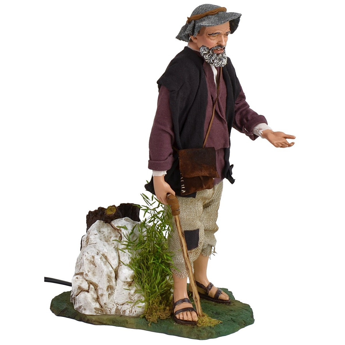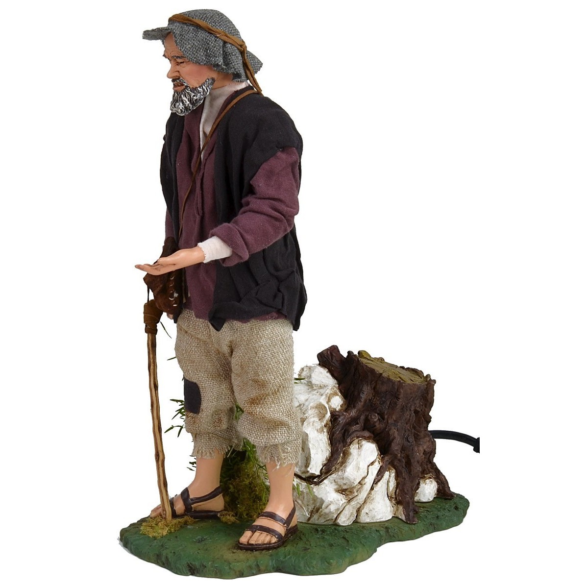 Hombre que pide limosna 30 cm Pigini en movimiento, con rostro muy expresivo, acabado en los más mínimos detalles y vestido con ropa de tela. La estatua mueve la cabeza y la mano abierta.