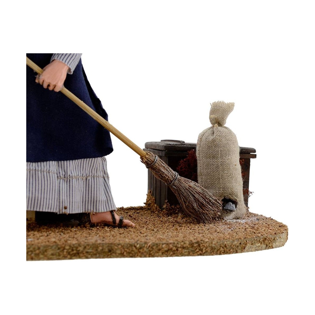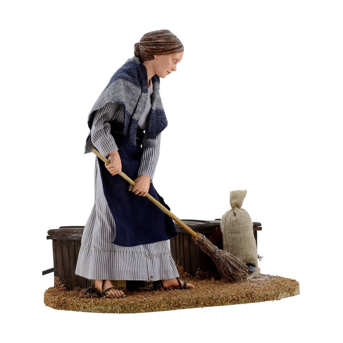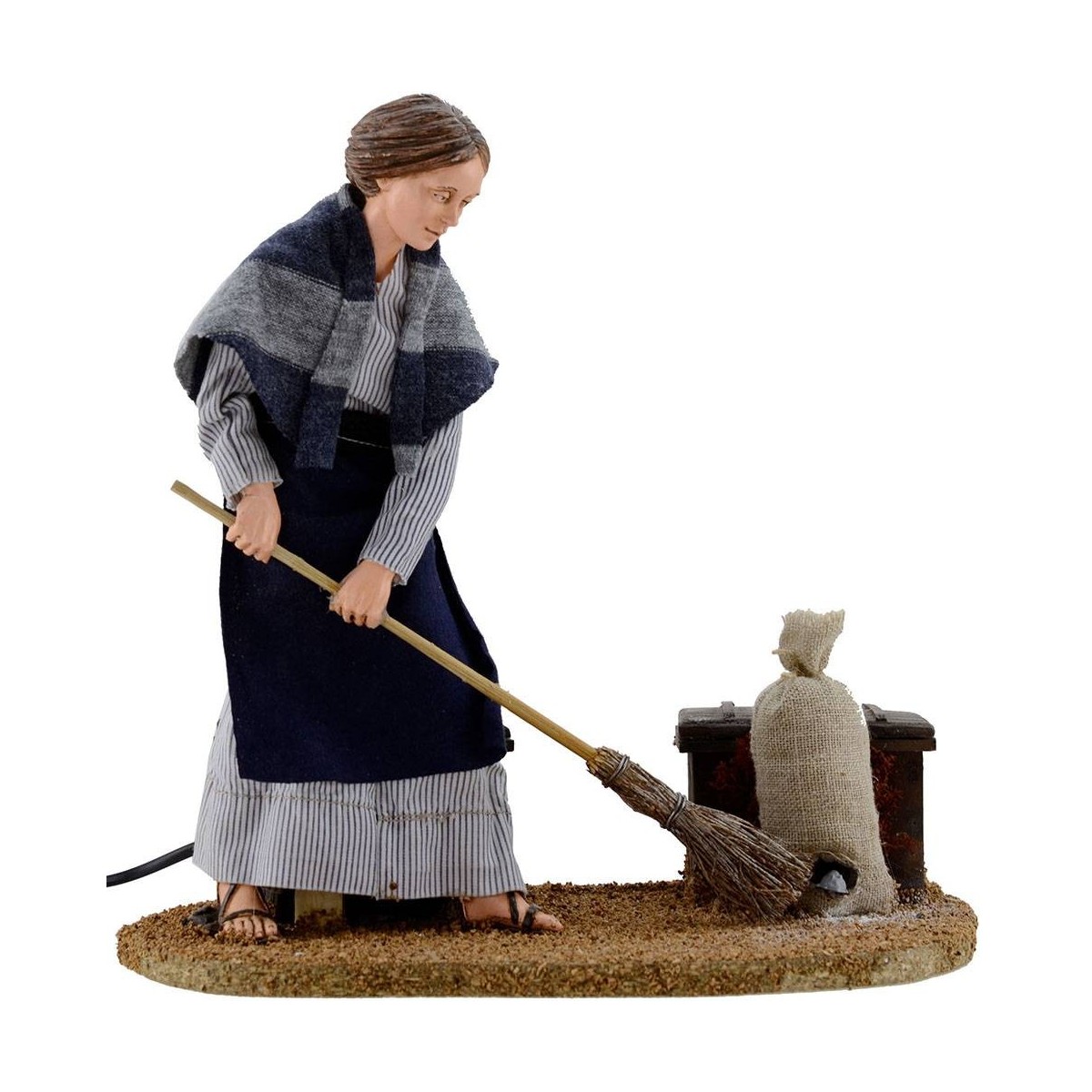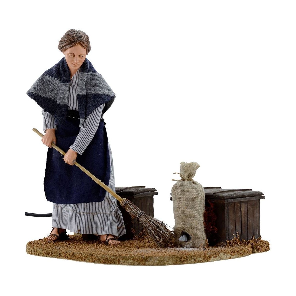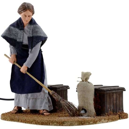 Mujer popular en movimiento ahuyenta un pequeño ratón para que salga del agujero de un saco de harina con un movimiento de la escoba que sostiene entre las manos, realizada en resina por hábiles manos artesanas italianas. El rostro tiene una excelente expresión que hace que la escena cobre vida, también gracias al hecho de que la estatua está cuidada en los más mínimos detalles, desde los colores, la ropa y el movimiento realmente muy realista y fluido. En la escena, nada se deja al azar: desde los dos cajones, el saco de harina, las sandalias de la mujer, hasta la escoba.
