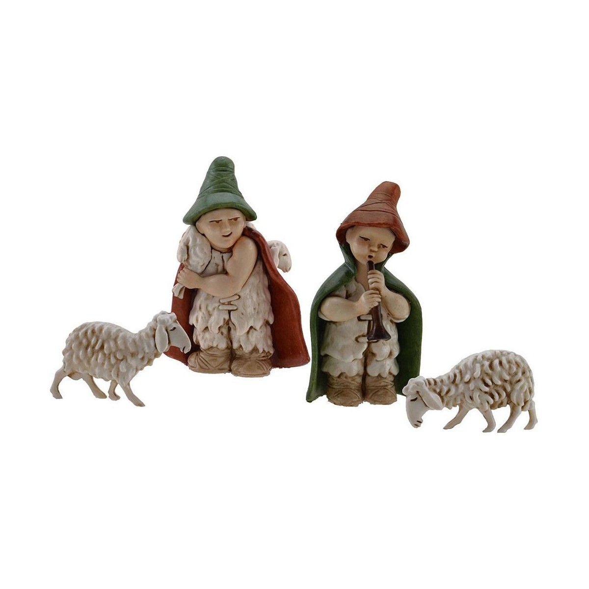 Juego compuesto por un pastor con oveja al hombro, un flautista y 2 ovejitas. Estatuas que representan a niños, altura 7 cm en plástico irrompible.