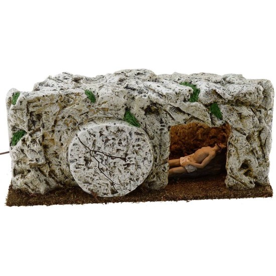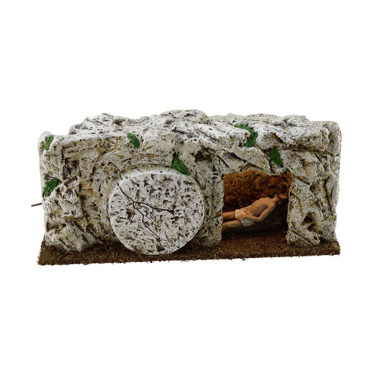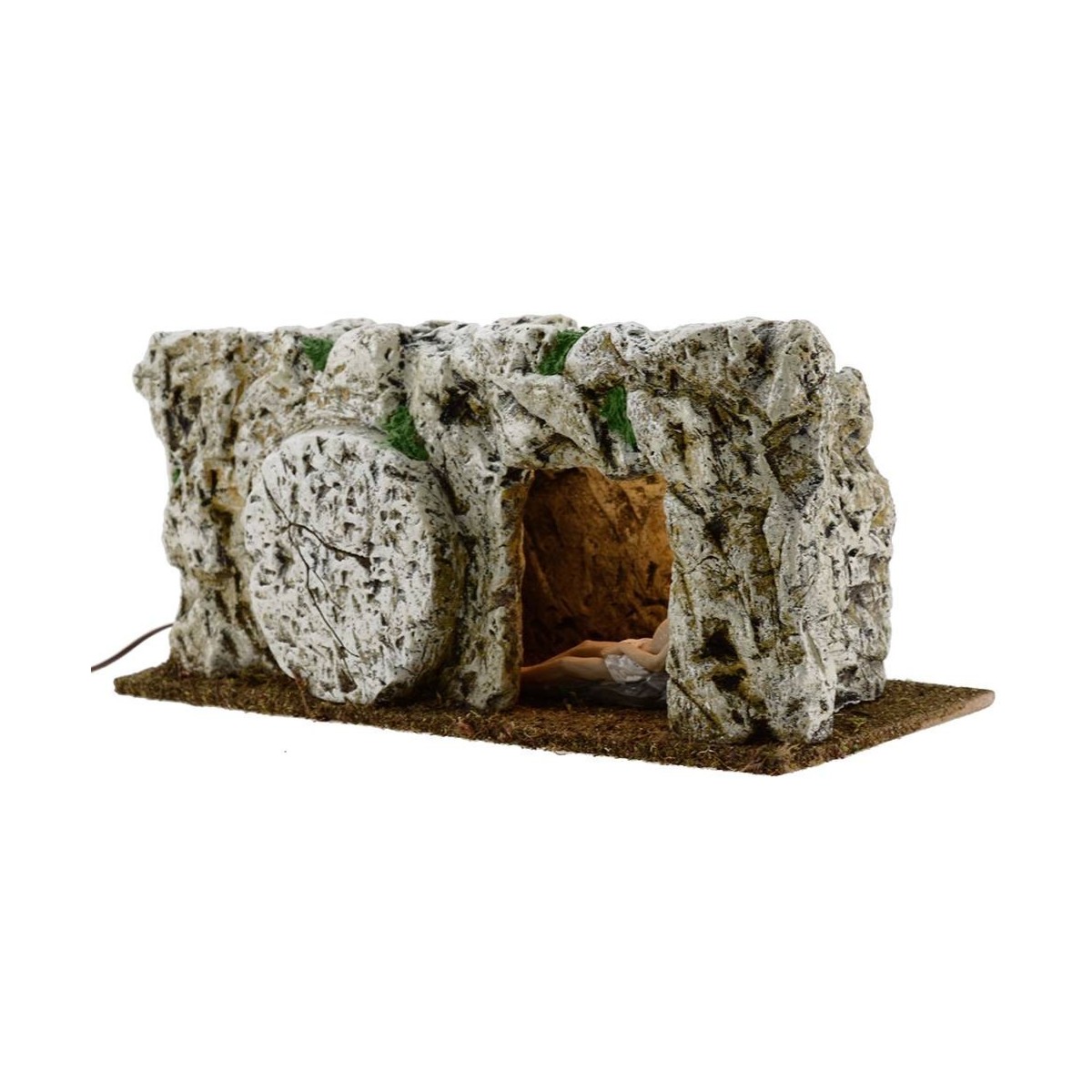 Sepulcro de resina iluminado con luces LED de color blanco cálido, completo con un adaptador de corriente de 12 voltios para su funcionamiento, incluida la estatua de resina de Jesús muerto, serie de 9 cm.