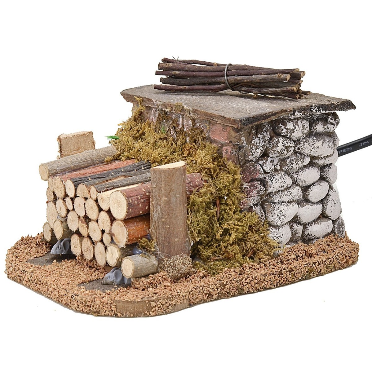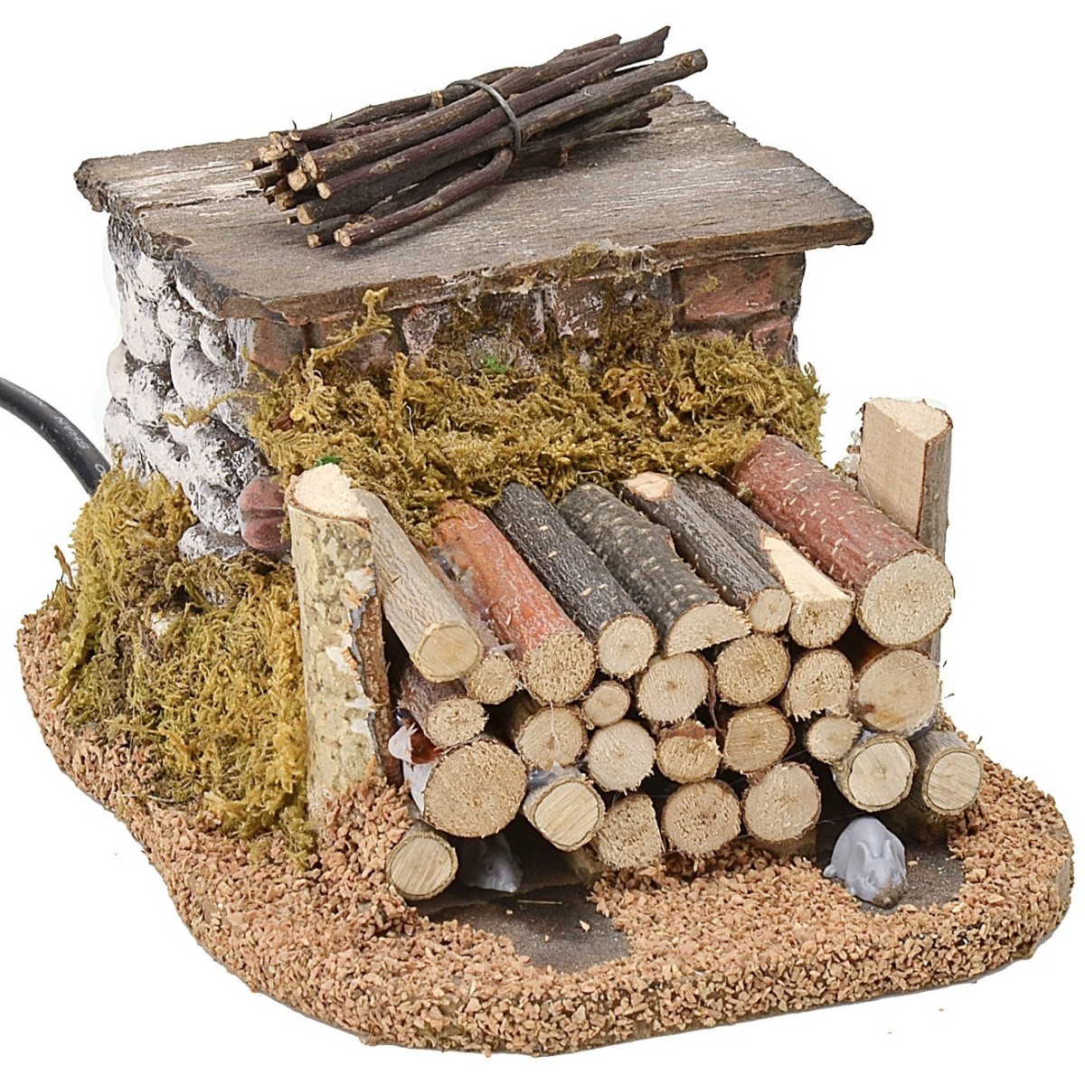 Escena con dos ratones en movimiento, realizada enteramente en Italia por manos artesanas expertas. El movimiento de los dos ratoncitos que entran y salen de su madriguera bajo el leñero resulta muy fluido. La escena ha sido acabada en detalle con un haz de leña y decorada con musgo, la pared trasera de grandes piedras sirve como cobertura para el mecanismo. Los ratones pueden combinarse con estatuas de altura de 12-15 cm.