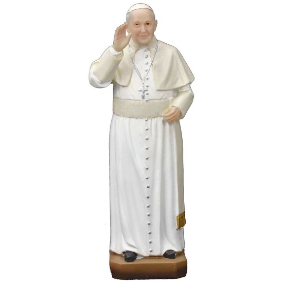 Papa Francisco, el nombre elegido en honor a San Francisco de Asís, patrón de Italia. La estatua es de resina, mide 20 cm de altura y se asemeja mucho a los rasgos de Papa Bergoglio. La reproducción es fiel a los parámetros papales, de hecho, viste la sotana blanca con la muceta y la faja, también blancas. El tocado se llama solideo y está combinado con el color de las vestimentas. Sobre la sotana, el Papa lleva la cruz pectoral con un cordón dorado. Las manos del Santo Padre representan el gesto de bendición que hace hacia los fieles.