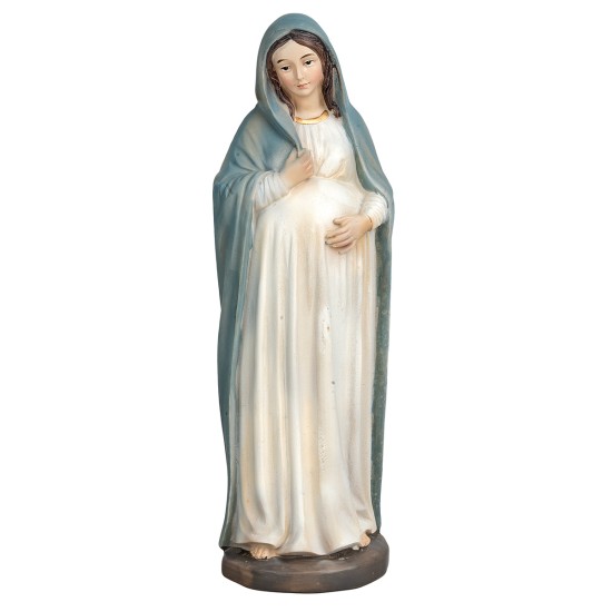 Estatua que representa a María embarazada, vestida con los habituales colores blanco y azul con detalles dorados, tiene un gran vientre sobre el que apoya las manos. Perfecta para embellecer tu pesebre de Pascua, las estatuas son de resina y están bien acabadas en los detalles. El producto es ideal para la creación de composiciones de Pascua como Dioramas y Pesebres.