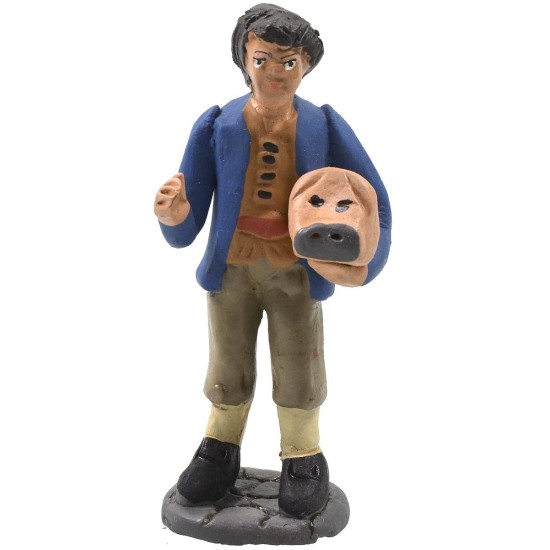Figura de terracota que representa a un carnicero con la cabeza de un cerdo en la mano, figurita estilo napolitano pintada a mano. Al estar realizada artesanalmente, los colores pueden variar ligeramente.