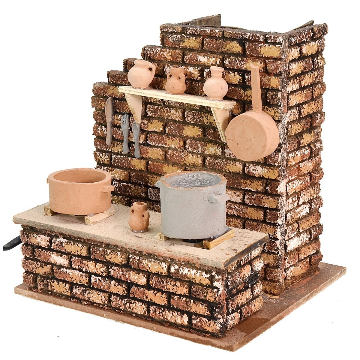 Cocina con olla efecto ebullición, completa con aireador para el funcionamiento. Dentro de la cocina hay una luz parpadeante que simula el fuego funcionando con corriente, recomendada para estatuas de 12-14 cm.