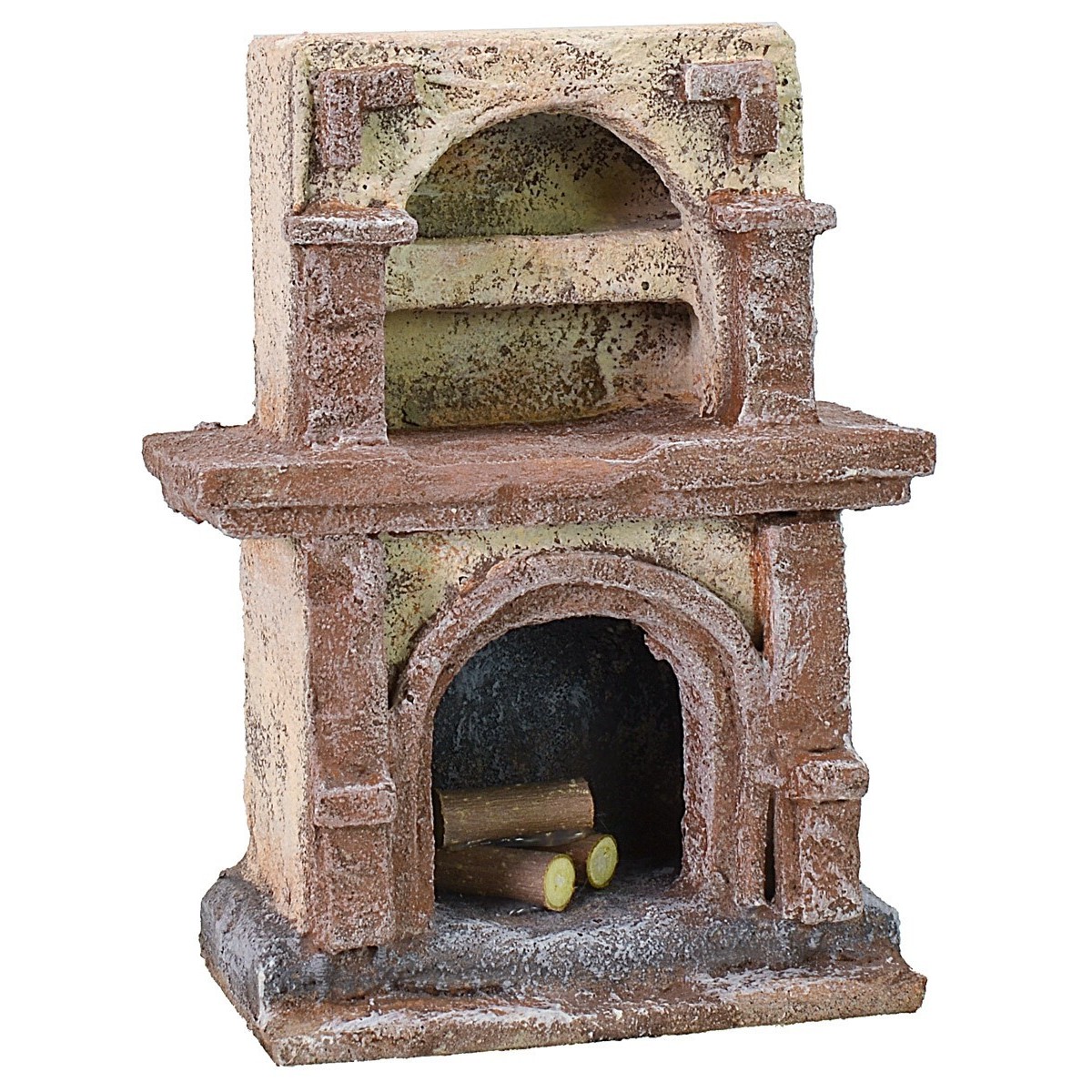 Majestuosa chimenea de estilo rústico con leña, caracterizada por un nicho con arco y estante para decorar con las muchas miniaturas disponibles en nuestra tienda. El artículo ha sido producido en Italia por hábiles manos artesanas en poliestireno, por lo tanto, es posible perforar la parte posterior para insertar una microlámpara o LED con efecto de fuego, este detalle hará que su ambiente sea aún más cálido. La pieza se recomienda para estatuas de una altura de 10 cm.