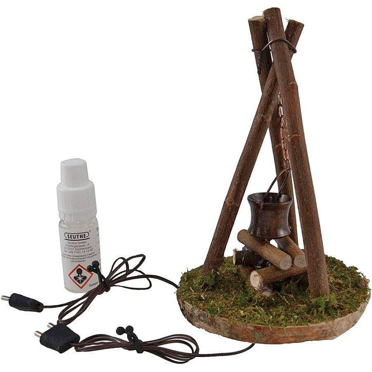 Fuego trípode con luz de fuego roja + cacerola efecto humo + líquido para humo 10 ml + portapilas 3xAA (baterías no incluidas).