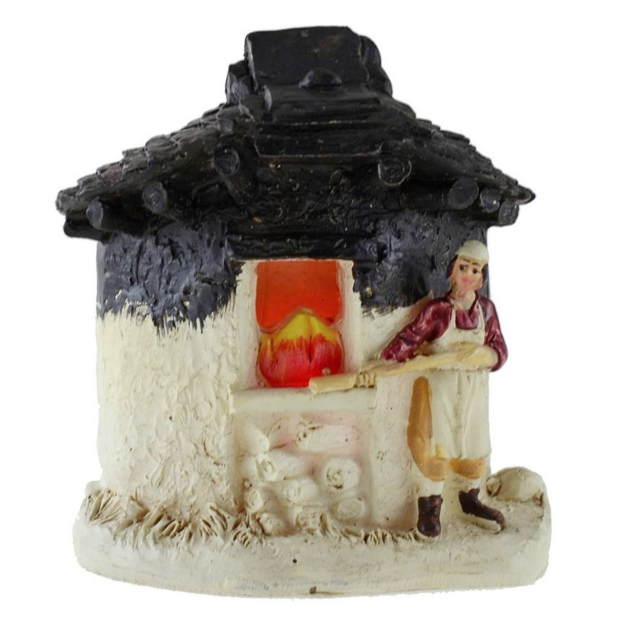 Composición monobloque en resina con panadero que hornea en el gran horno circular provisto de luz fija roja con baterías incluidas que simula perfectamente el fuego ardiente. A esta escena se le pueden combinar las estatuas para belén de la serie Landi Moranduzzo de 6 cm.