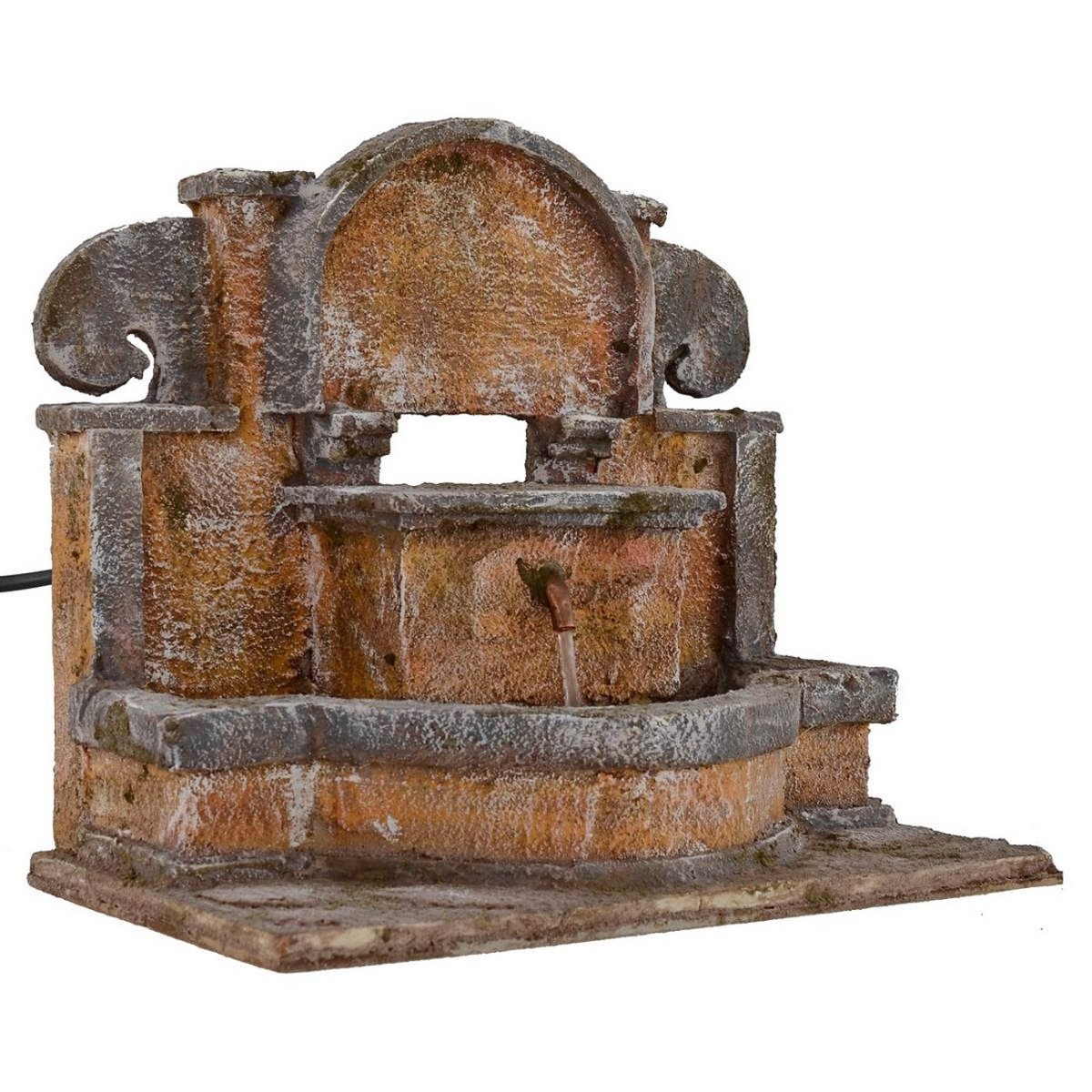 Fuente completa con bomba que funciona con corriente. La estructura presenta elegantes decoraciones como arcos y grecas, haciendo que la fuente sea muy importante. La pila, con forma de semicírculo, se ensancha a los lados. En la pared de la pila se encuentra el pico de cobre del que brota el agua. El artículo está hecho de poliestireno y madera por hábiles manos artesanas italianas para el Belén clásico popular y se recomienda para estatuas de altura de 10 a 12 cm.