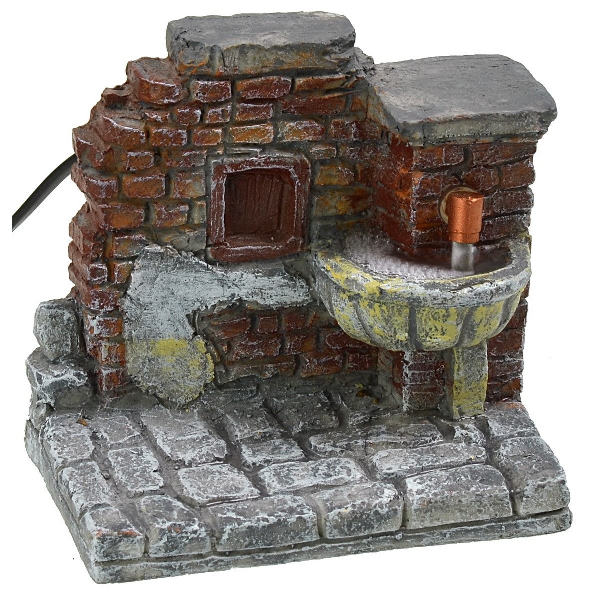 Fuente de esquina con estanque semicircular anclado a una pared de resina con efecto ladrillo, el juego de agua está garantizado por la bomba incluida de reciclaje continuo y funciona con corriente. El producto está hecho de resina y se recomienda para estatuas de altura 10 h cm.