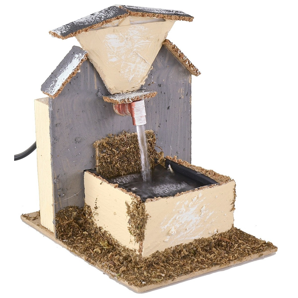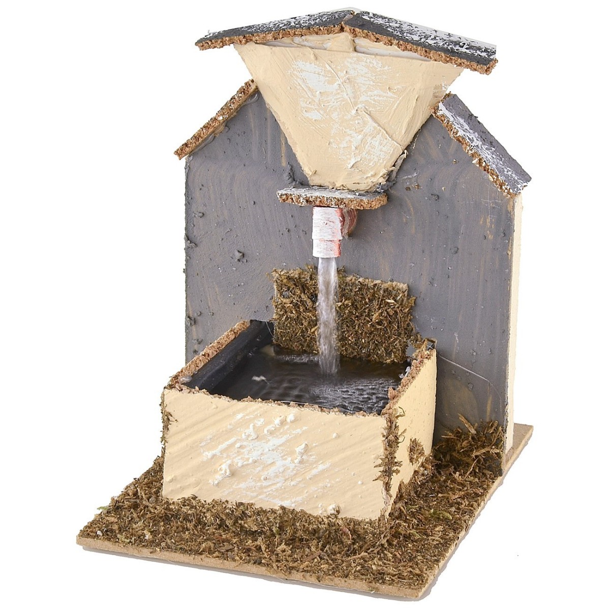 Fuente para belén completa con bomba para el reciclaje de agua que funciona con corriente. El artículo está hecho artesanalmente en Italia utilizando madera, corcho y musgo. La fuente es recomendada para belenes con estatuas de altura de 10 a 12 cm.
