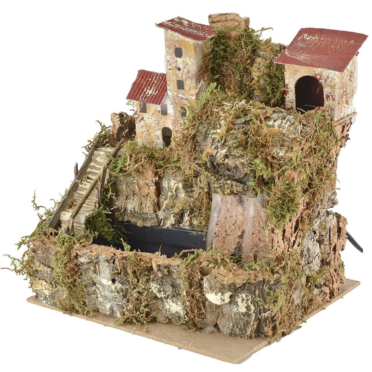 Paisaje montañoso para belén caracterizado por dos niveles unidos por escaleras a la izquierda. En el nivel inferior hay una cascada de velo, mientras que en el superior un pueblo de casitas. Este artículo para belén incluye una bomba para la recirculación del agua que funciona con corriente y ha sido realizado con madera, corcho y musgo. La escena puede completarse delante con figuritas de 8-10 cm de altura, mientras que en la parte superior para crear un efecto de lejanía se recomiendan figuritas para belén más pequeñas.
