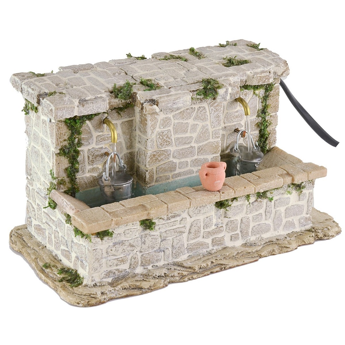 Lavadero para belén con dos grifos, completo con bomba que funciona con corriente. La estructura de la fuente de resina está acabada en piedra y presenta una forma rectangular constituida por tres secciones: una pared central más prominente y dos externas con los grifos de donde brota el agua; se especifica que se incluyen dos cubos que se pueden colocar a gusto debajo del dispensador. En primer plano, una gran tina de recolección caracterizada por un adorno plano delante, mientras que a los lados hay dos lavaderos oblicuos. Este accesorio para el belén hecho a mano ha sido creado artesanalmente en Italia y se recomienda para estatuas de altura de 8 a 10 cm.