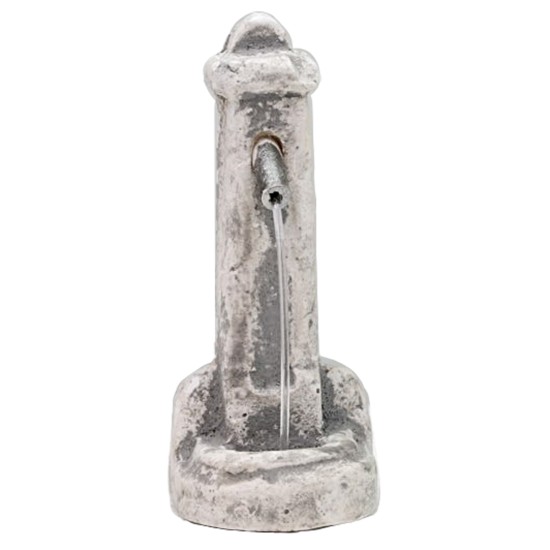 Fuente de columna realizada en yeso, caracterizada por una coloración blanca con matices grises que le confieren un aspecto realista. Presenta un pequeño tubito transparente que simula el efecto del agua corriente.