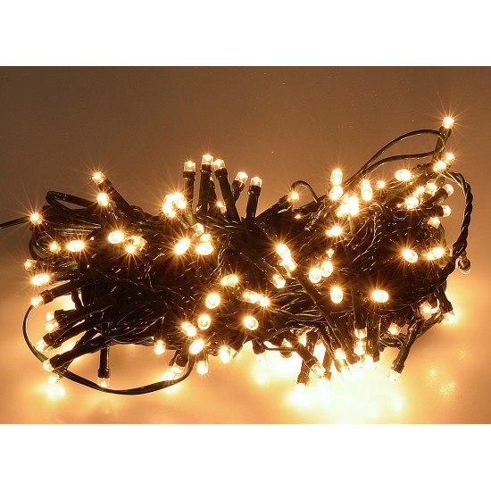 Cadena con 180 leds blanco cálido de 14 metros de largo, es adecuada tanto para interiores como para exteriores. Cada led tiene una distancia de 5 cm y completa con juegos de luz.
