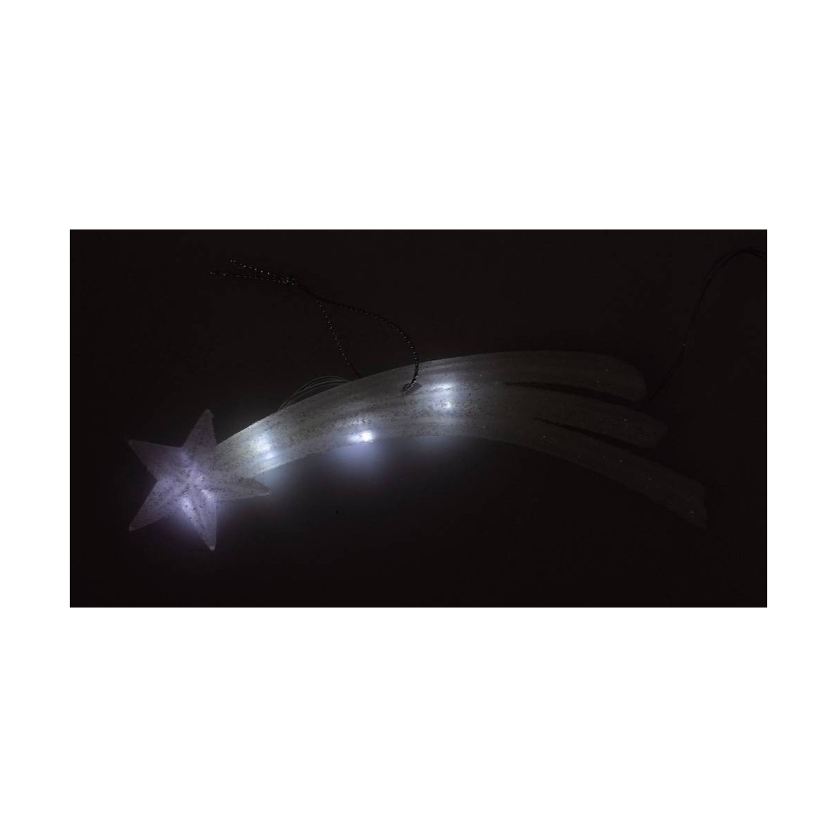 Estrella cometa con 4 luces LED blancas frías que funcionan con baterías 2xAA (no incluidas). El LED situado detrás de la estrella parpadea, mientras que los tres situados en la cola de la estrella permanecen fijos. La estrella cometa está decorada con purpurina blanca que la hace luminosa y brillante.