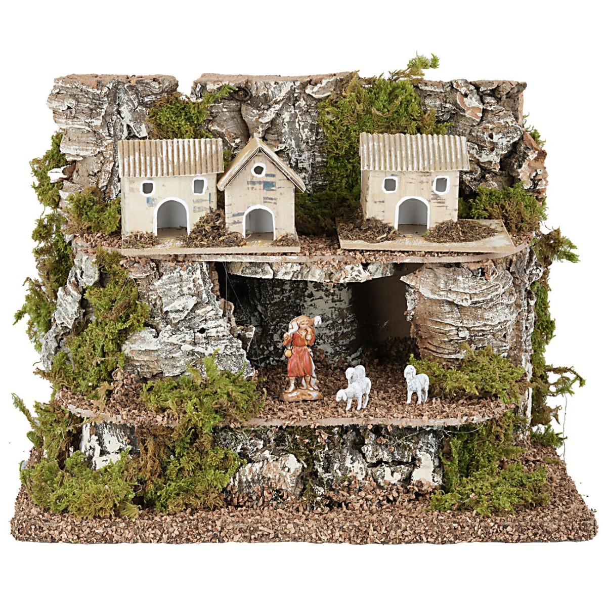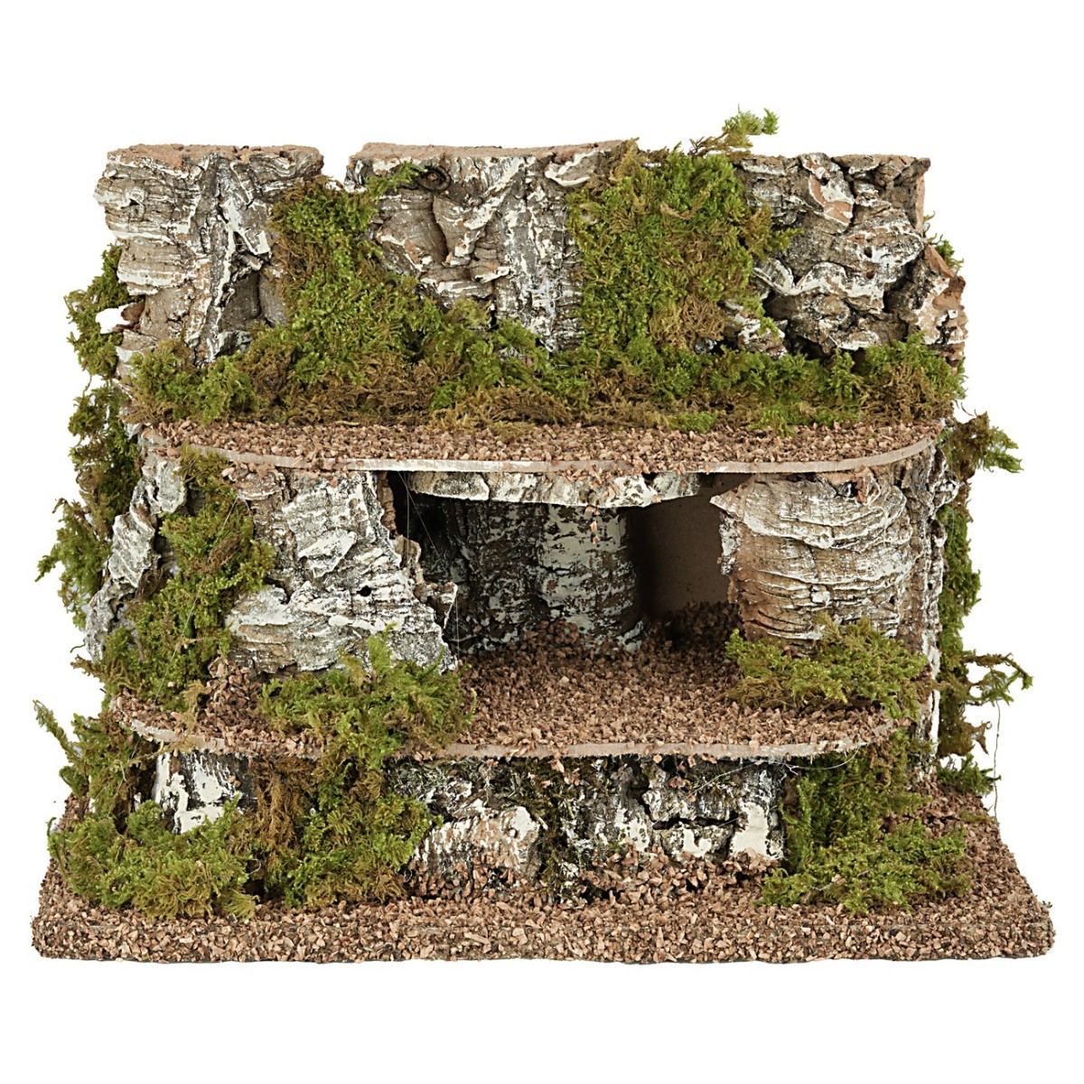 Estructura en varios niveles para la creación de escenas en diferentes alturas. La ambientación presenta dos niveles con una cavidad en la parte central que se puede decorar a gusto con figuras de 3,5 cm de altura, como se muestra en la foto. Cabe destacar que las casitas se pueden comprar por separado en los productos relacionados bajo la tabla. El artículo ha sido realizado artesanalmente en Italia en madera, corcho y liquen.