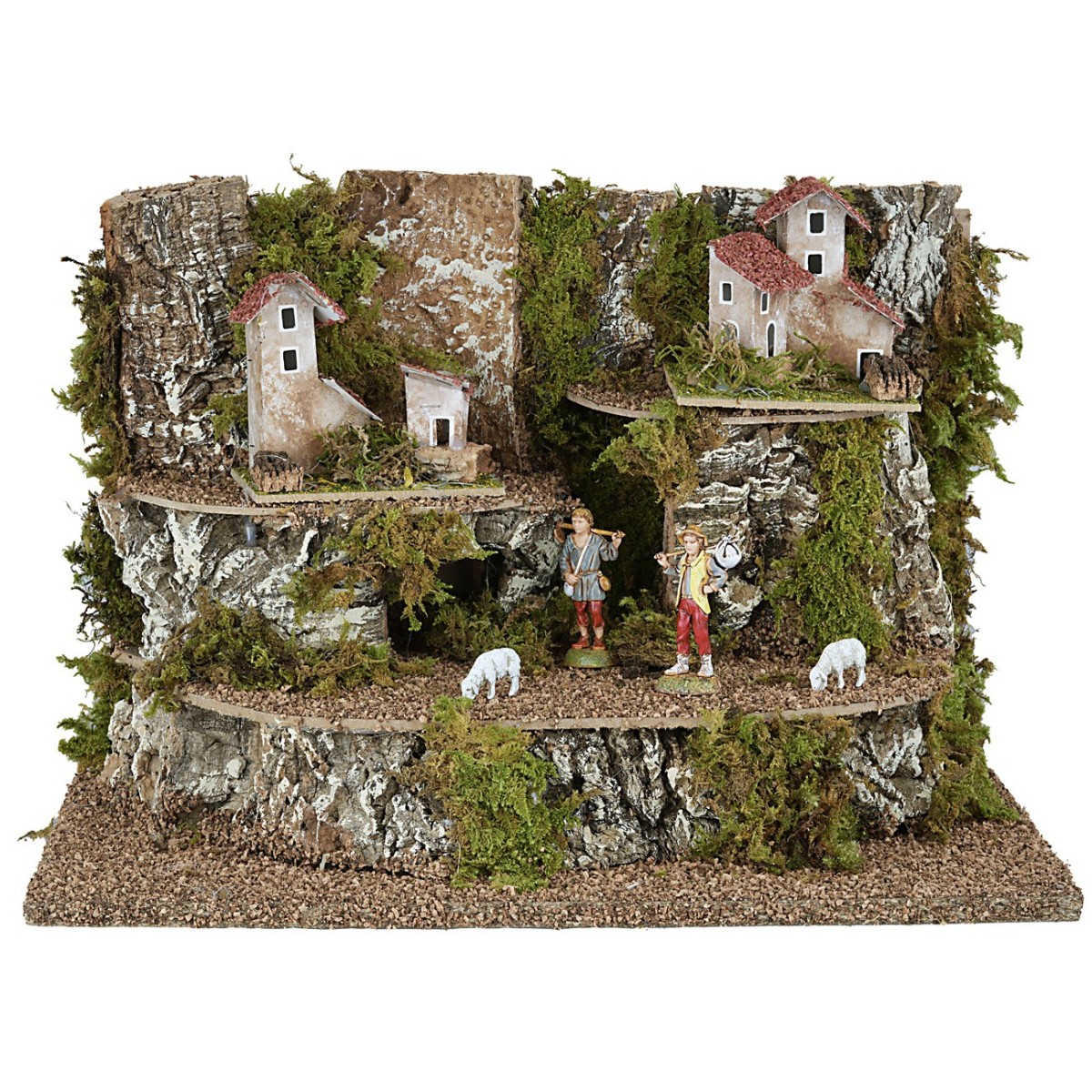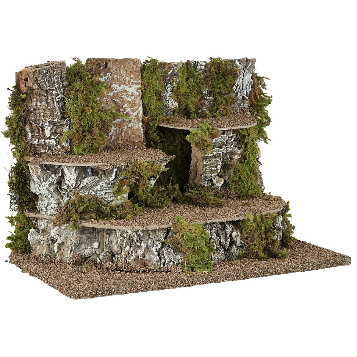 Estructura de tres niveles que representa realísticamente un paisaje de montaña. Las diferentes capas y terrazas crean un efecto escenográfico, con espacio para elementos del belén en cada nivel. Está realizada principalmente con materiales naturales como madera, corcho y musgo, lo que añade un toque realista y natural, evocando un ambiente rústico y montañoso. Se precisa que las casitas no están incluidas y se pueden adquirir por separado en los productos relacionados debajo de la tabla.