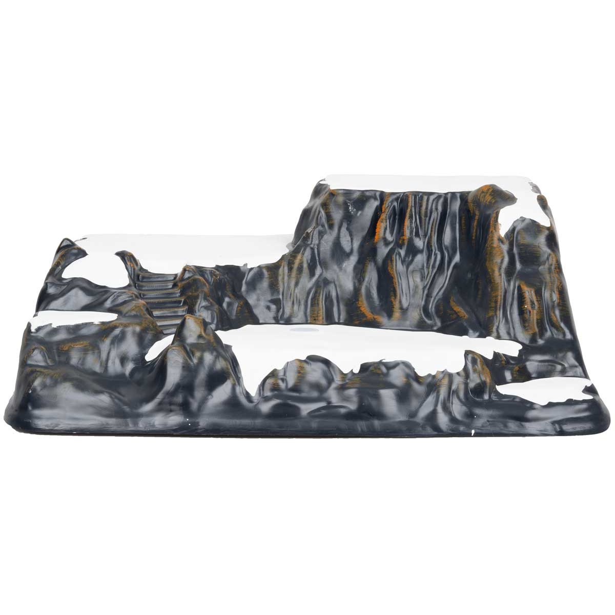 Escenario de montaña nevada en dos niveles, hecho de plástico, representa un entorno montañoso invernal. Este paisaje es adecuado para completar el pesebre o el pueblo navideño, ofreciendo profundidad y un elemento invernal a las decoraciones.