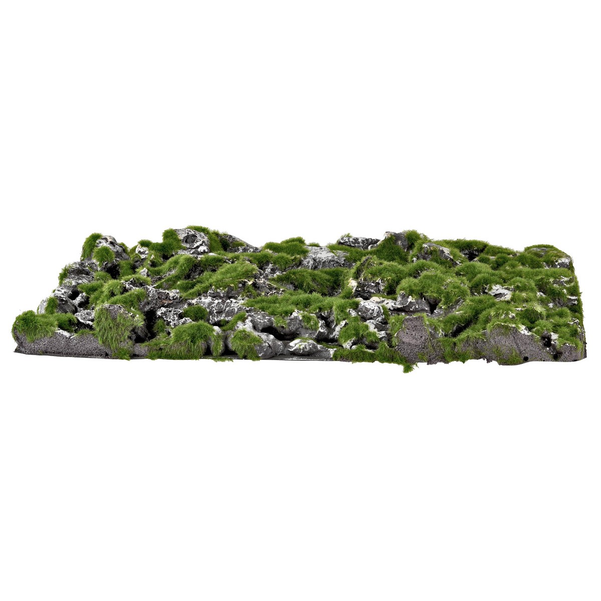 Realizado con rocas modeladas en poliestireno, este tapete está adornado con un efecto de musgo realista creado con esponja sintética.