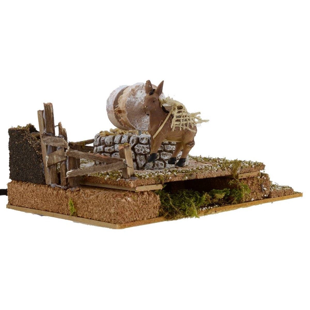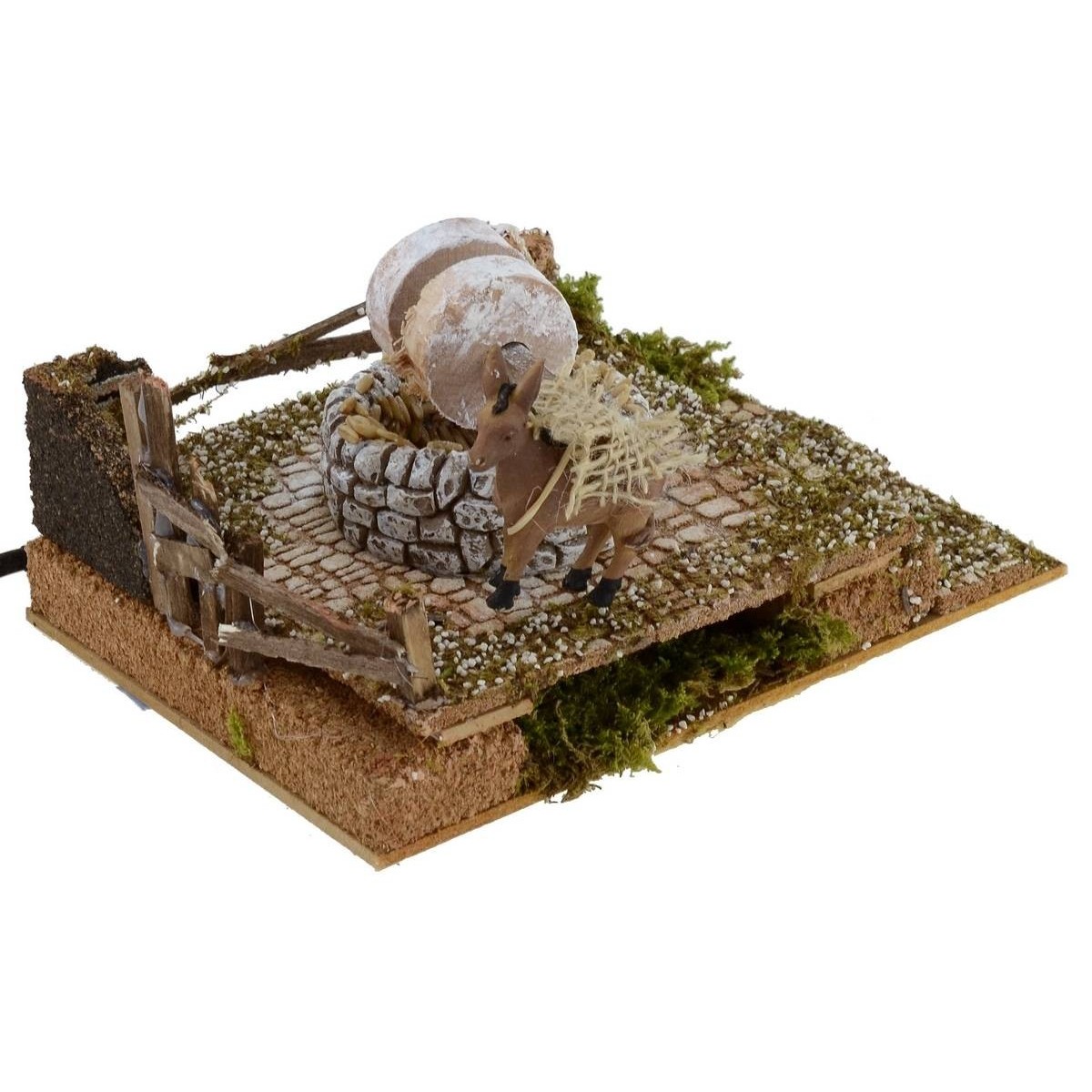 Molino con burro en movimiento, funcionando con corriente. La escenografía ha sido realizada en Italia por hábiles manos artesanas y está bien acabada en los detalles. El perímetro alrededor del molino está delineado por una valla de madera y el entorno está caracterizado por elementos faunísticos. El burro tiene dimensiones: 5,5 (ancho) x 2 (profundidad) x 6,5 (altura) cm y está hecho de resina. Producto recomendado para estatuas de 8-10 cm.