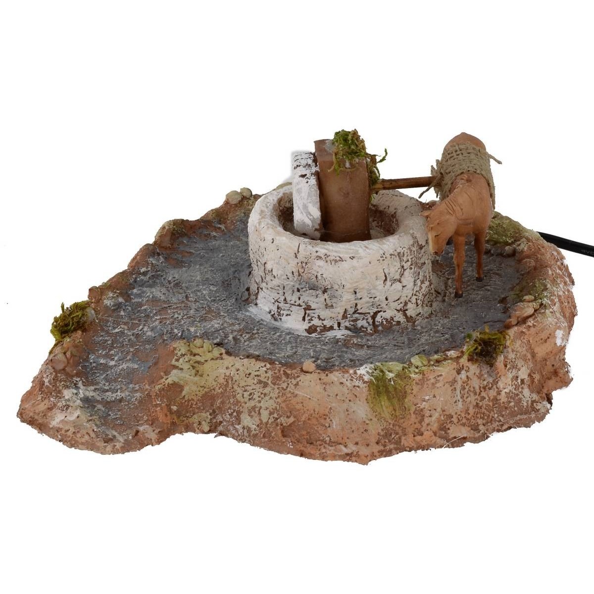 Molino con caballo en movimiento, funcionando con corriente. La escenografía ha sido realizada en Italia por hábiles manos artesanas utilizando resina y está bien acabada en los detalles. El perímetro circundante está caracterizado por elementos faunísticos. El caballo tiene dimensiones: 8,5 (ancho) x 2 (profundidad) x 6 (alto) cm y está hecho de pvc. Producto recomendado para estatuas de 10 cm.