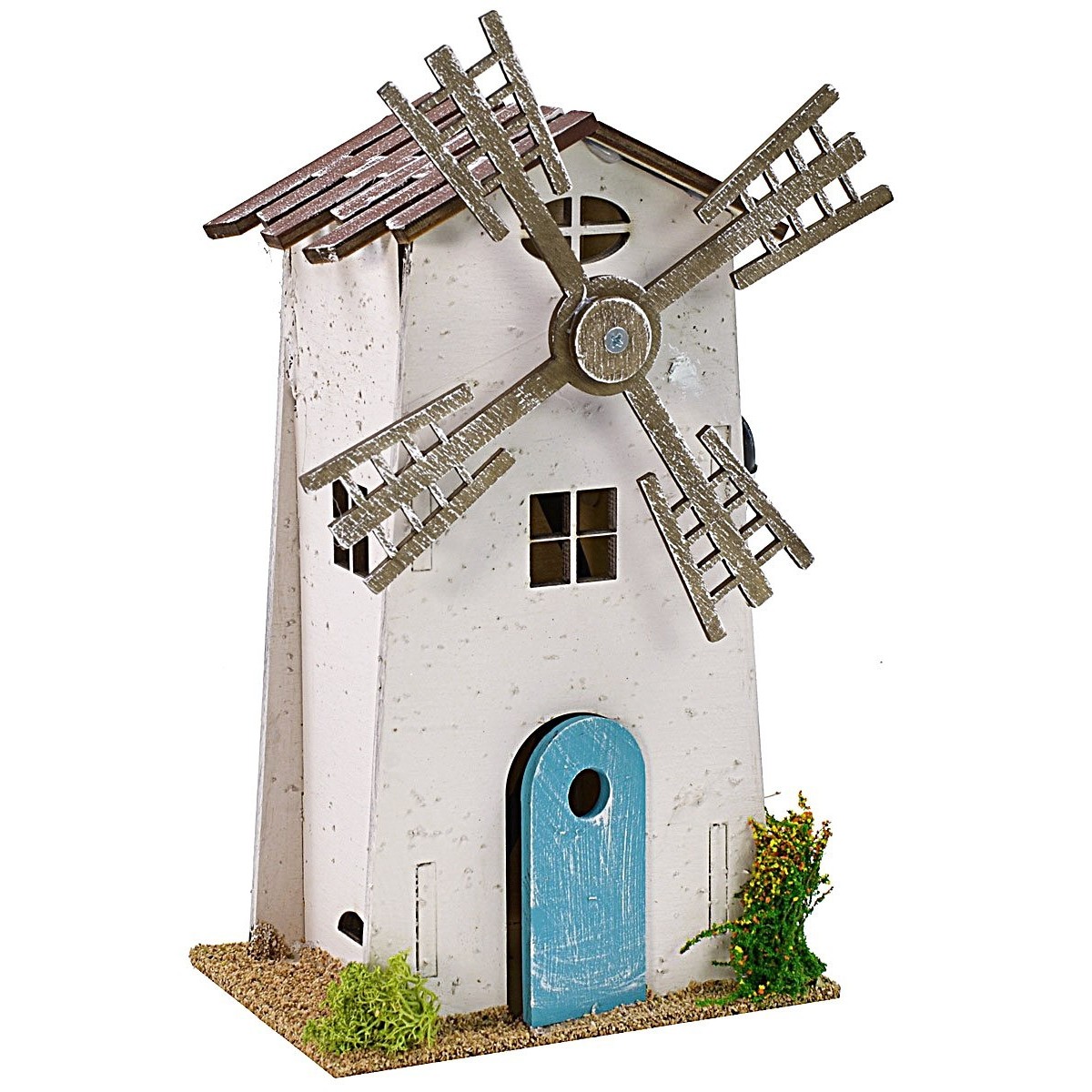 Molino de viento para belén, la alimentación eléctrica permite mover las aspas y simular el movimiento que provoca el viento. La estructura es muy bonita y está decorada con ventanas geométricas, un techo inclinado con tablas de madera y una puerta de entrada azul. El artículo está bien acabado en los detalles y ha sido producido en Italia con madera, corcho y musgo.