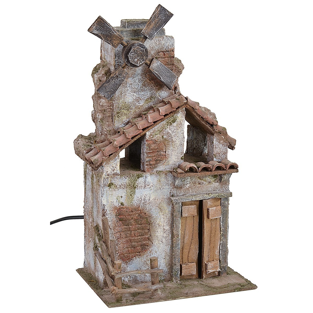 Molino de viento para el Belén que funciona con corriente, la estructura es vertical con varios niveles. En el piso inferior hay una cerca de madera que conduce hacia el gran portón de dos hojas, el techo es inclinado y abierto como un granero donde se pueden colocar los objetos y herramientas para almacenar. Encima hay una gran torre a la que están ancladas las cuatro aspas de madera del molino que giran. El artículo es adecuado para estatuas de altura de 10 cm y ha sido realizado en Italia por hábiles manos artesanas con poliestireno y madera.