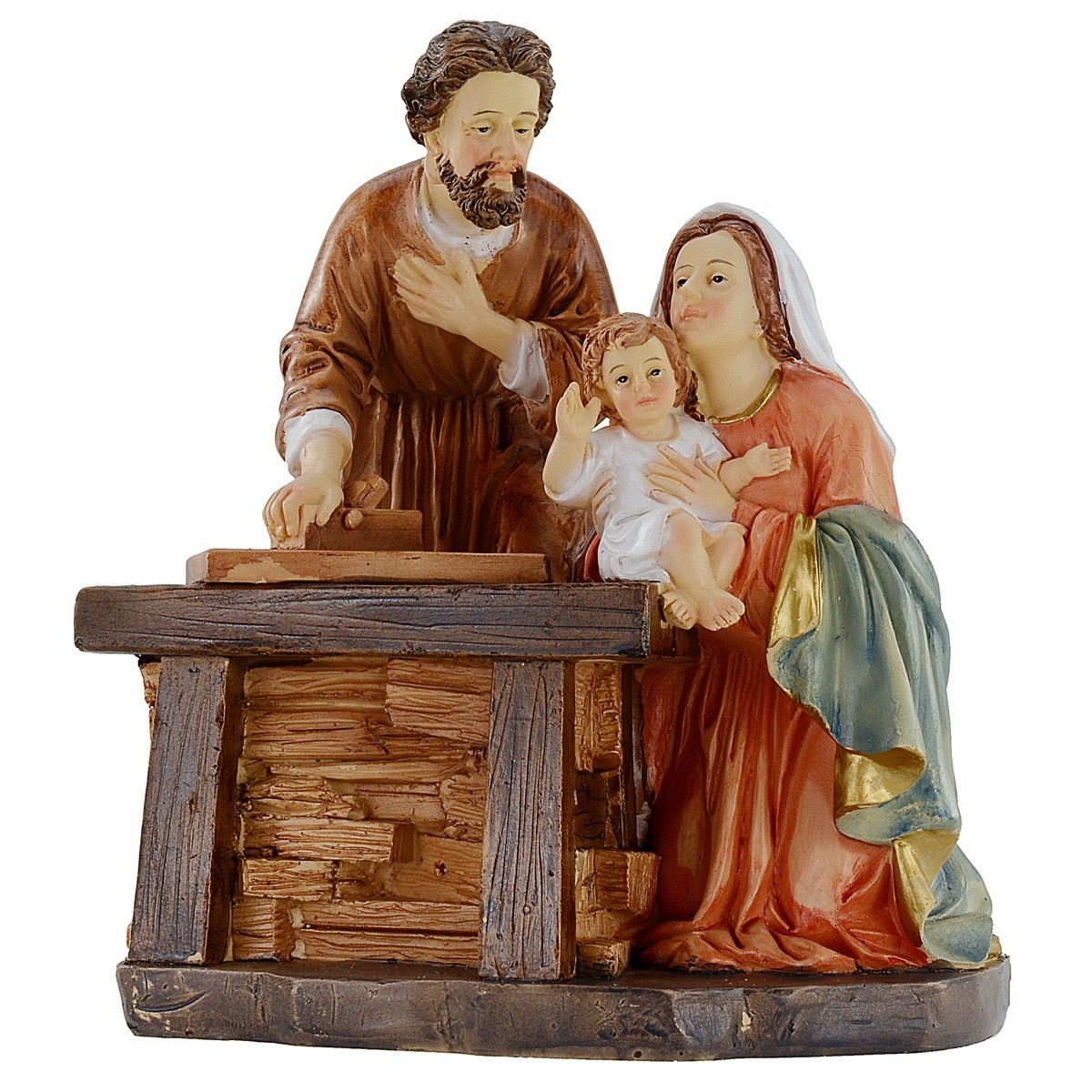 Familia en estatua única, que comprende: San José, María y el niño Jesús. Producto realizado completamente en resina. En particular, San José mide realmente 18 cm (incluida la base) y está ocupado trabajando con madera en un banco de carpintero, María, arrodillada, tiene una altura de 13 cm (incluida la base) y el niño Jesús, sentado en el banco de trabajo, tiene una dimensión de 5 cm. Los sujetos de la estatua en cuestión tienen rostros expresivos y bien detallados.