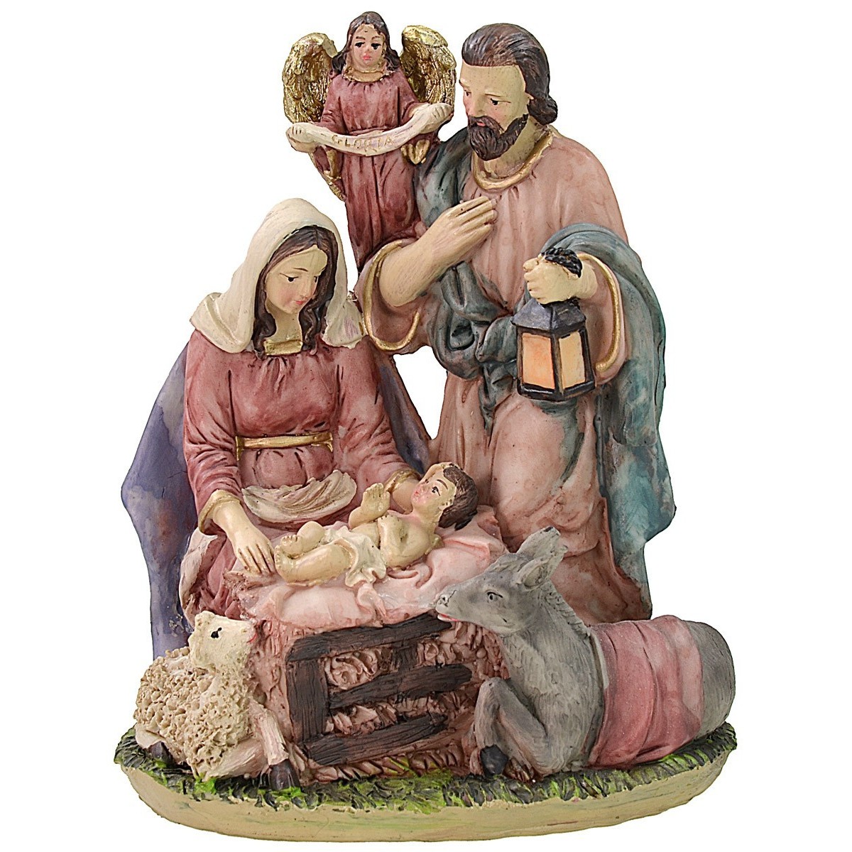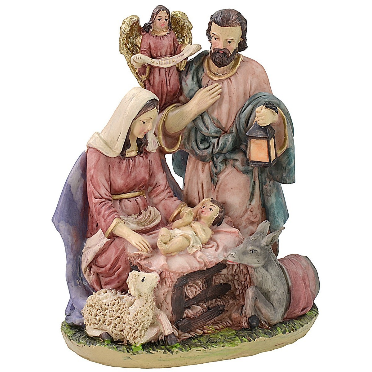 Natividad en resina compuesta por un bloque, de dimensiones 15,5x11, que incluye: San José, María, el niño Jesús, un angelito, un burro y una ovejita en serie de 20 cm. San José tiene una altura de 18 cm, María arrodillada mide 14 cm, la cuna del niño Jesús tiene dimensiones de 7x7,5 cm, el ángel mide 8 cm mientras que los animales tienen una altura de 7 y 4 cm respectivamente.