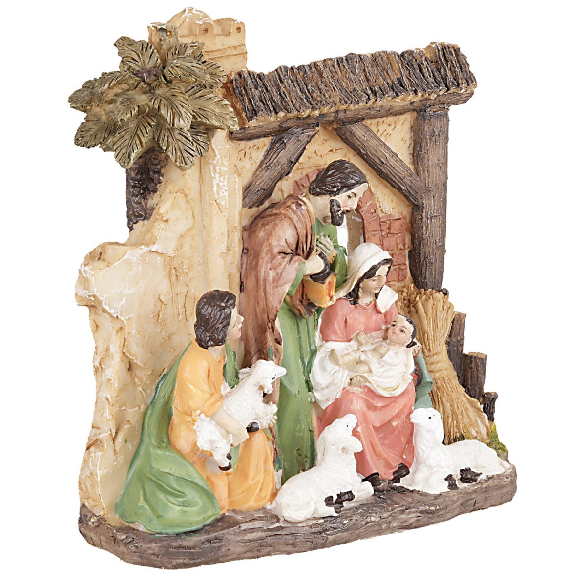 Sagrada familia en resina pintada a mano serie 10 cm que comprende San José, la Virgen María, el Niño Jesús, un pastor y tres ovejitas. La escena representa a María sentada sosteniendo en sus brazos a Jesús, José está inclinado con una linterna hacia su hijo recién nacido y todos los personajes presentes están mirando hacia aquel que hace pocos instantes ha venido al mundo. También hay una sencilla ambientación que crea el fondo de la escena y hace que la natividad sea más inmersiva.