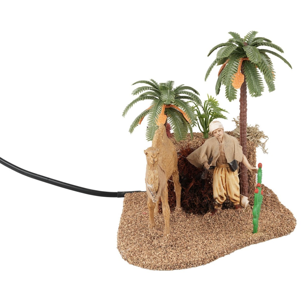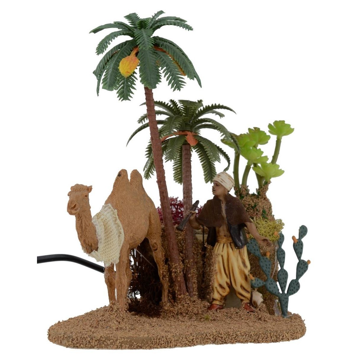 Oasis en el desierto con camello y camellero en movimiento: el camello levanta y baja la cabeza y el hombre palestino con el brazo derecho acerca el catalejo a los ojos como si hubiera visto un espejismo, las estatuas son de la serie Landi Moranduzzo 10 cm. La escena resulta realmente única en su género dado el doble movimiento, los juegos de color de la vegetación además de las alturas de las plantas que aportan vivacidad. Esta escena ha sido realizada enteramente en Italia para tu Pesebre.