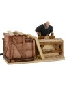 Carpintero serie 10 cm Oliver con movimiento horizontal de los brazos cepilla una tabla de madera en el banco de trabajo, a la izquierda un mueble con tablas y herramientas. Escena y movimiento realistas cuidados en los detalles, de hecho, el cepillado está enriquecido con virutas y la estatua Oliver tiene una capa de tela.