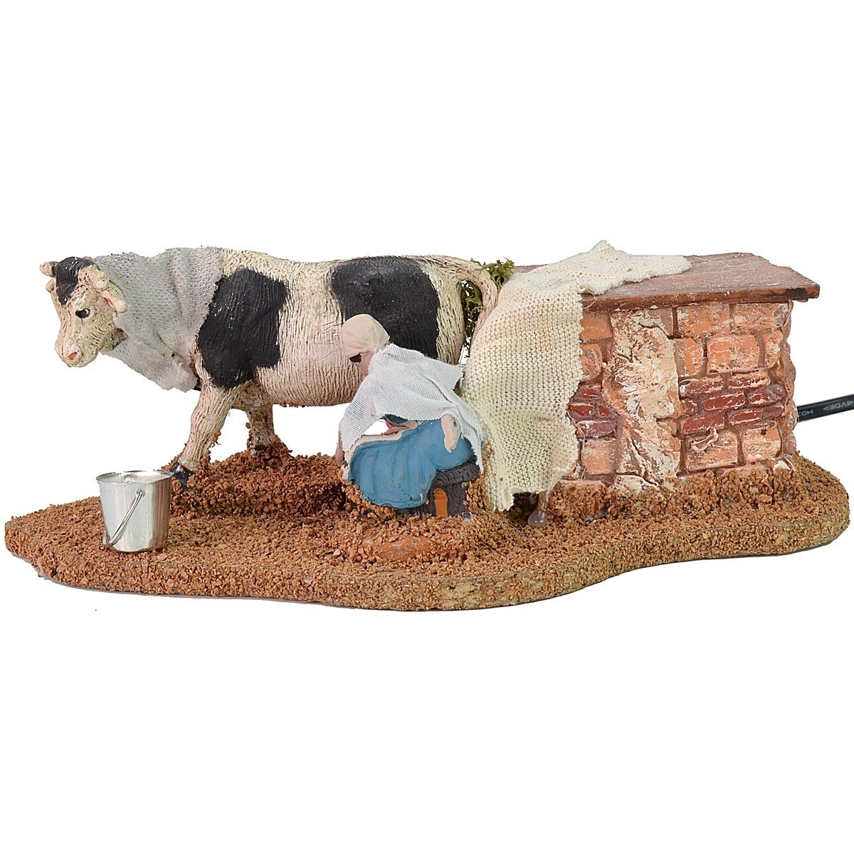 Escena con doble movimiento: la campesina serie 10 cm Oliver que alzando y bajando el brazo ordeña la vaca que mueve el cuello de derecha a izquierda. Estatua para Belén movible en Italia, bien acabada en los detalles con manto de tela y rostro muy expresivo. La escena está enriquecida por un muro de piedra en resina cubierto por tablas de madera, musgo y un cubo de metal. El artículo funciona con corriente.