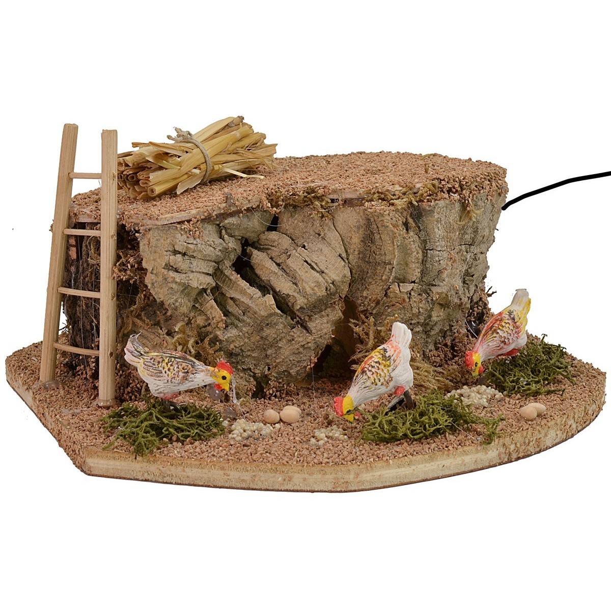 Escena con triple movimiento: las tres gallinas se mueven en la acción de picotear las semillas. La escena está enriquecida con una escalera de madera, un manojo de paja, huevos, musgo y algunas semillas.